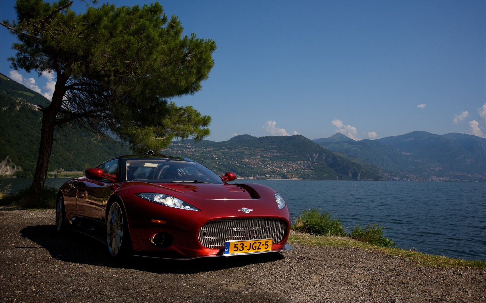 Sport rotes auto spinne steht auf wasserhintergrundSport rotes Auto Spinne steht auf Wasserhintergrund