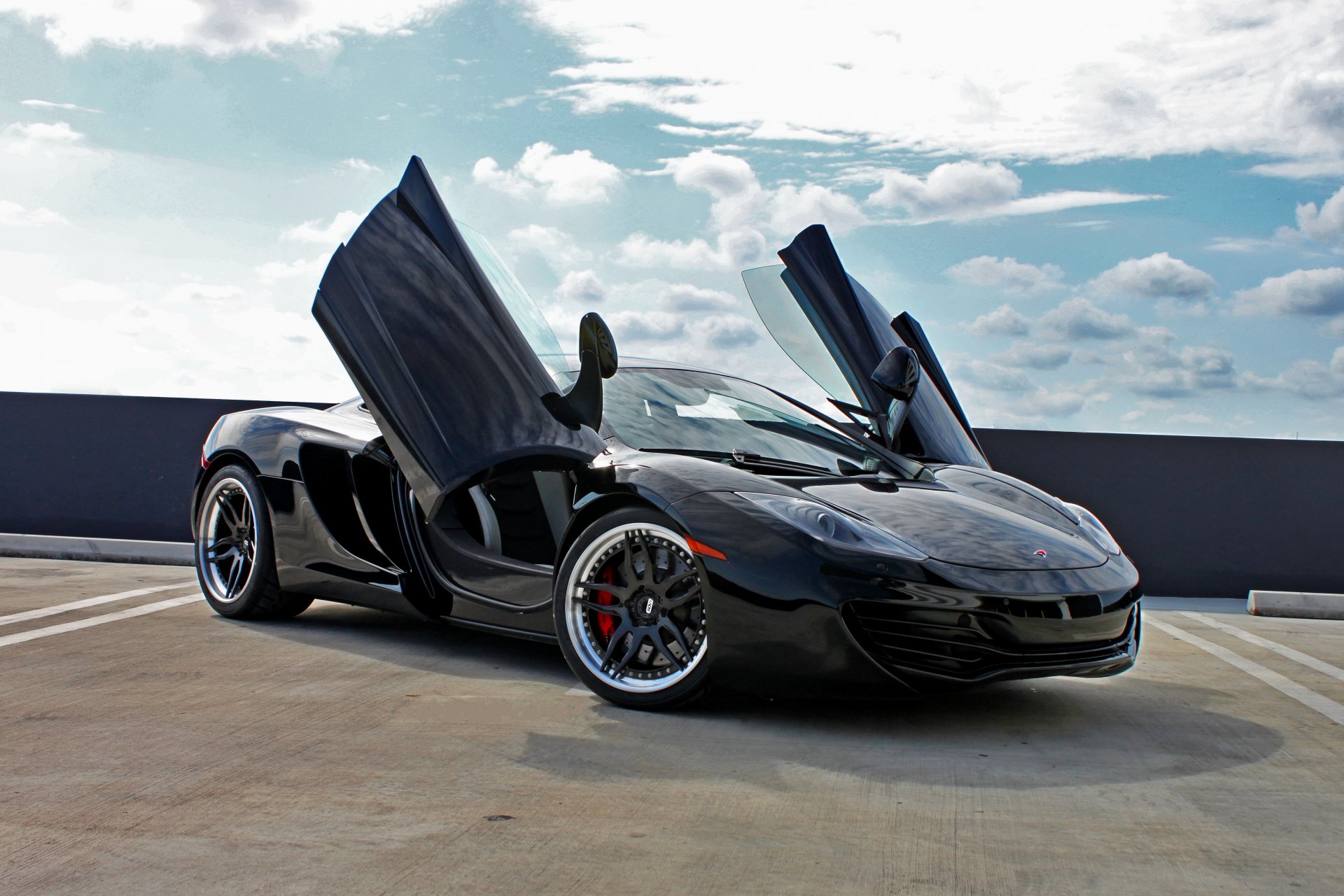 Der rote mclaren mp4-12c steht mit eingeschalteten scheinwerfern und offenen türenDer rote McLaren mp4-12c steht mit eingeschalteten Scheinwerfern und offenen Türen