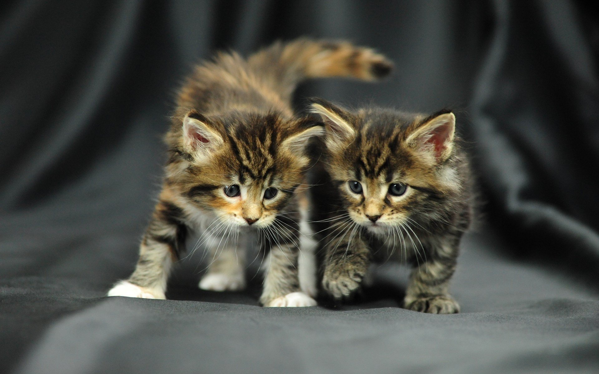 Foto von stehenden Kätzchen. Flauschige Kleinkinder auf schwarzem Hintergrund