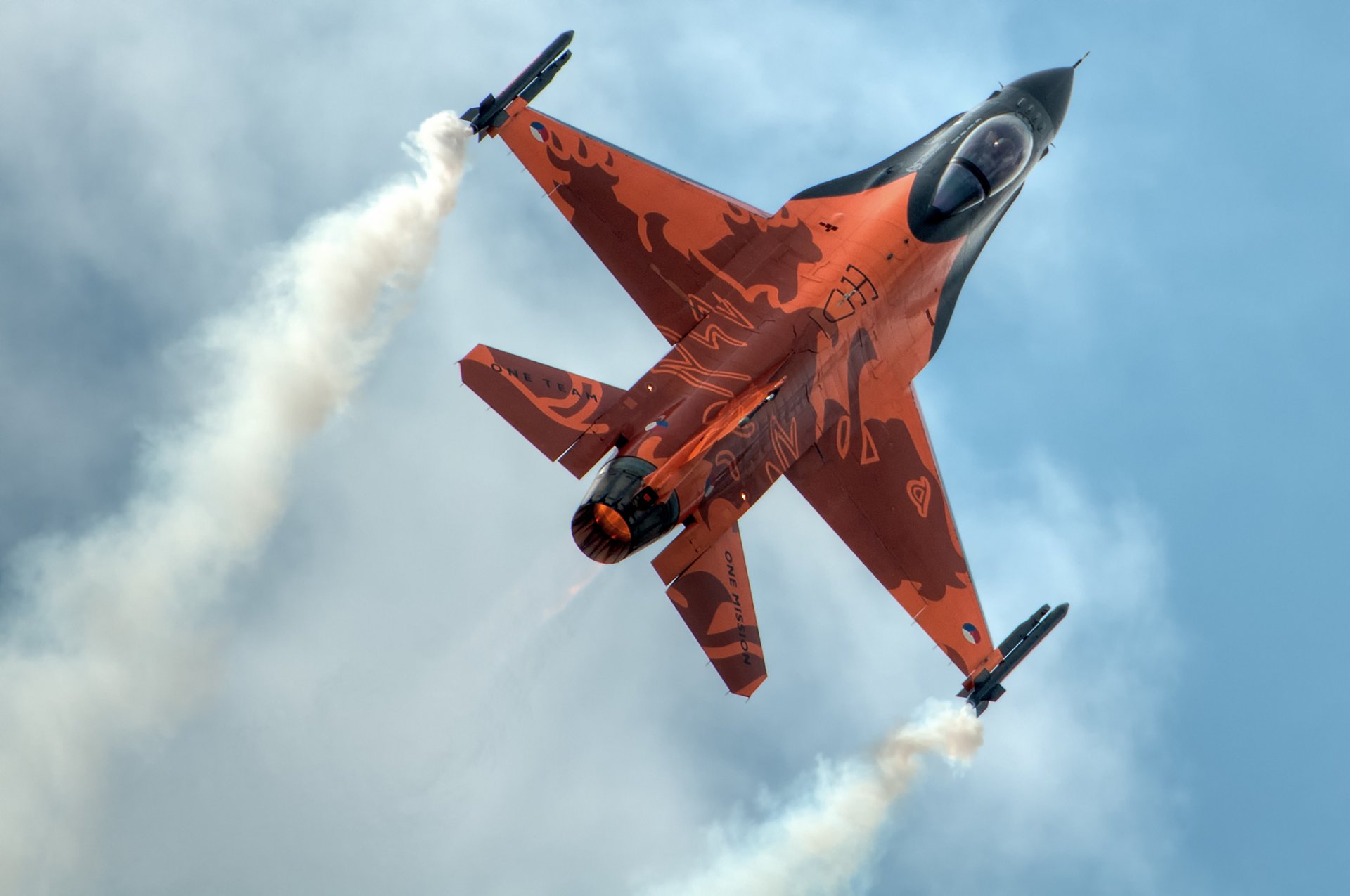 Ein F-16 "Fighting Falcon" -Mehrzweckjäger in roter Färbung vor einem blauen Himmelshintergrund.