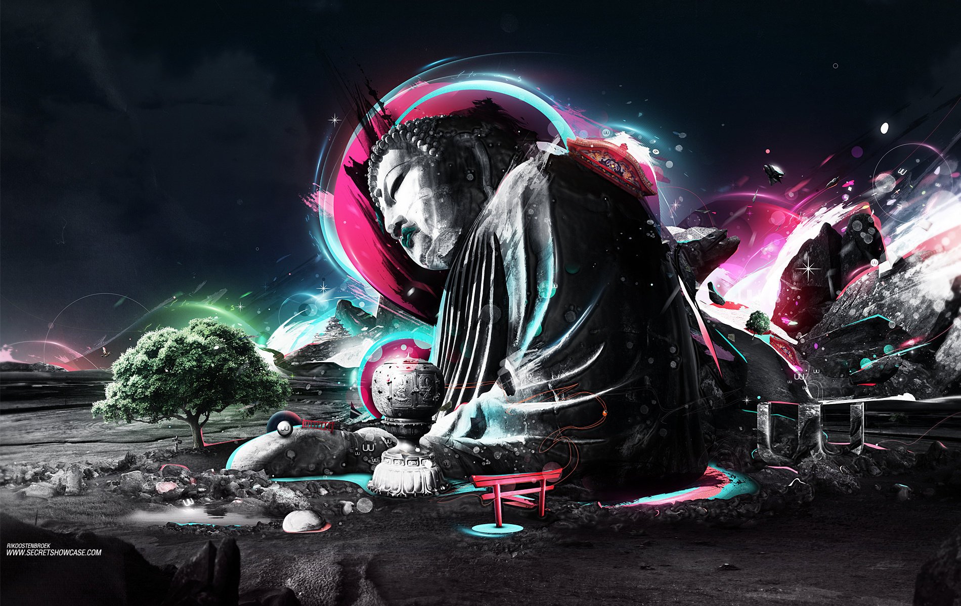 Buddha-Steinskulptur im Wüstenraum