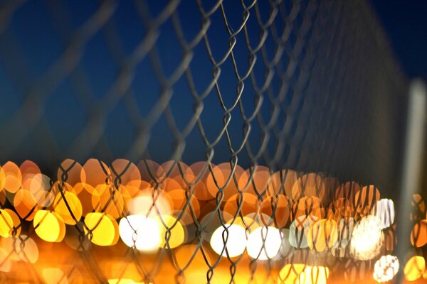 Metallgitterzaun mit orangefarbenen lichtern von laternenMetallgitterzaun mit orangefarbenen Lichtern von Laternen