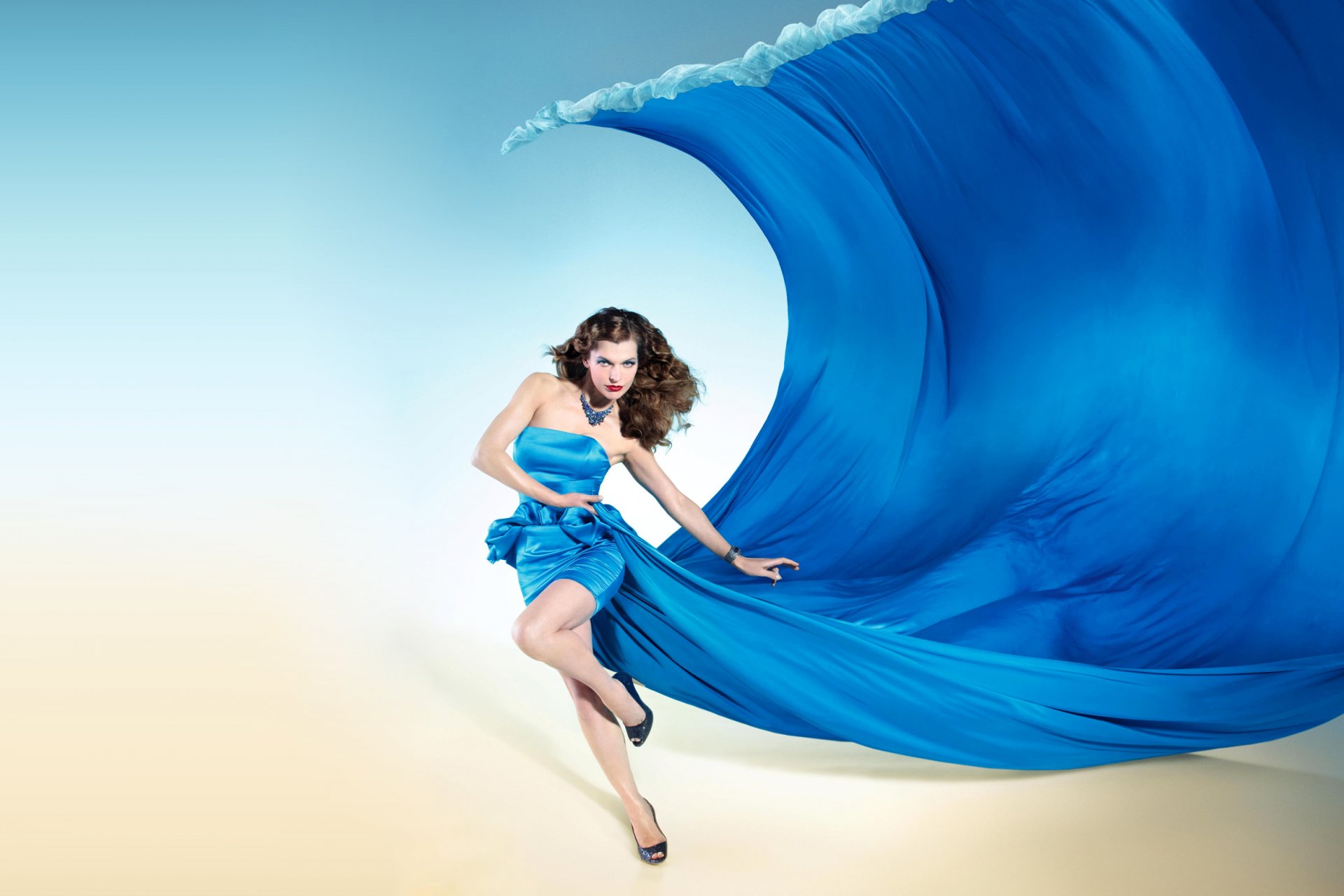 Ein Mädchen in einem blauen Kleid, dessen Saum wie eine Welle aussieht