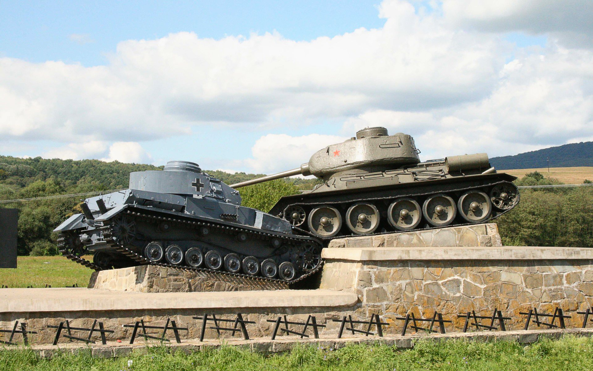 Gedenkstätte auf einem steinsockel zwei panzer im ungleichen kampfGedenkstätte auf einem Steinsockel zwei Panzer im ungleichen Kampf