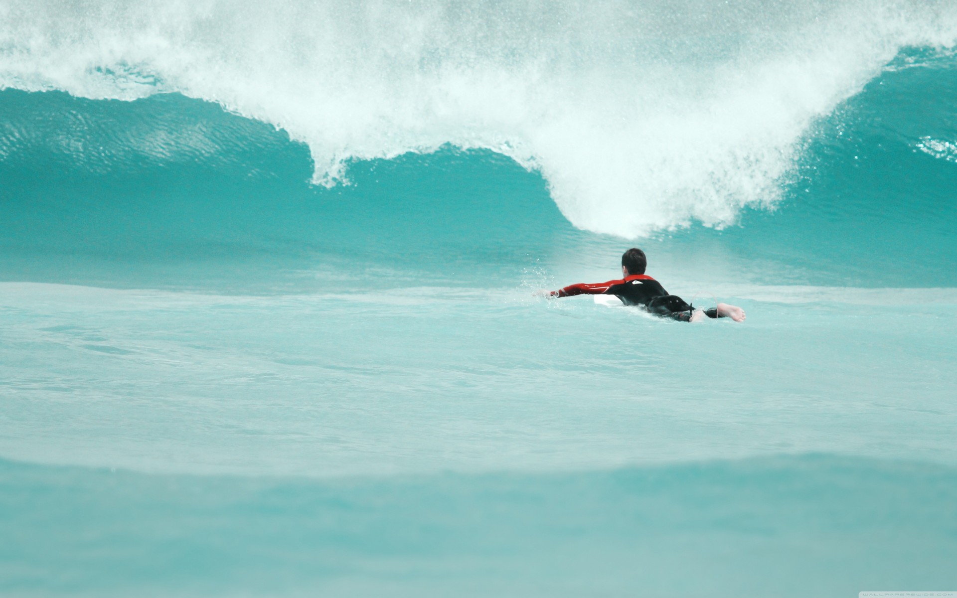 Ein Surfer schwimmt auf einer Welle der azurblauen Farbe