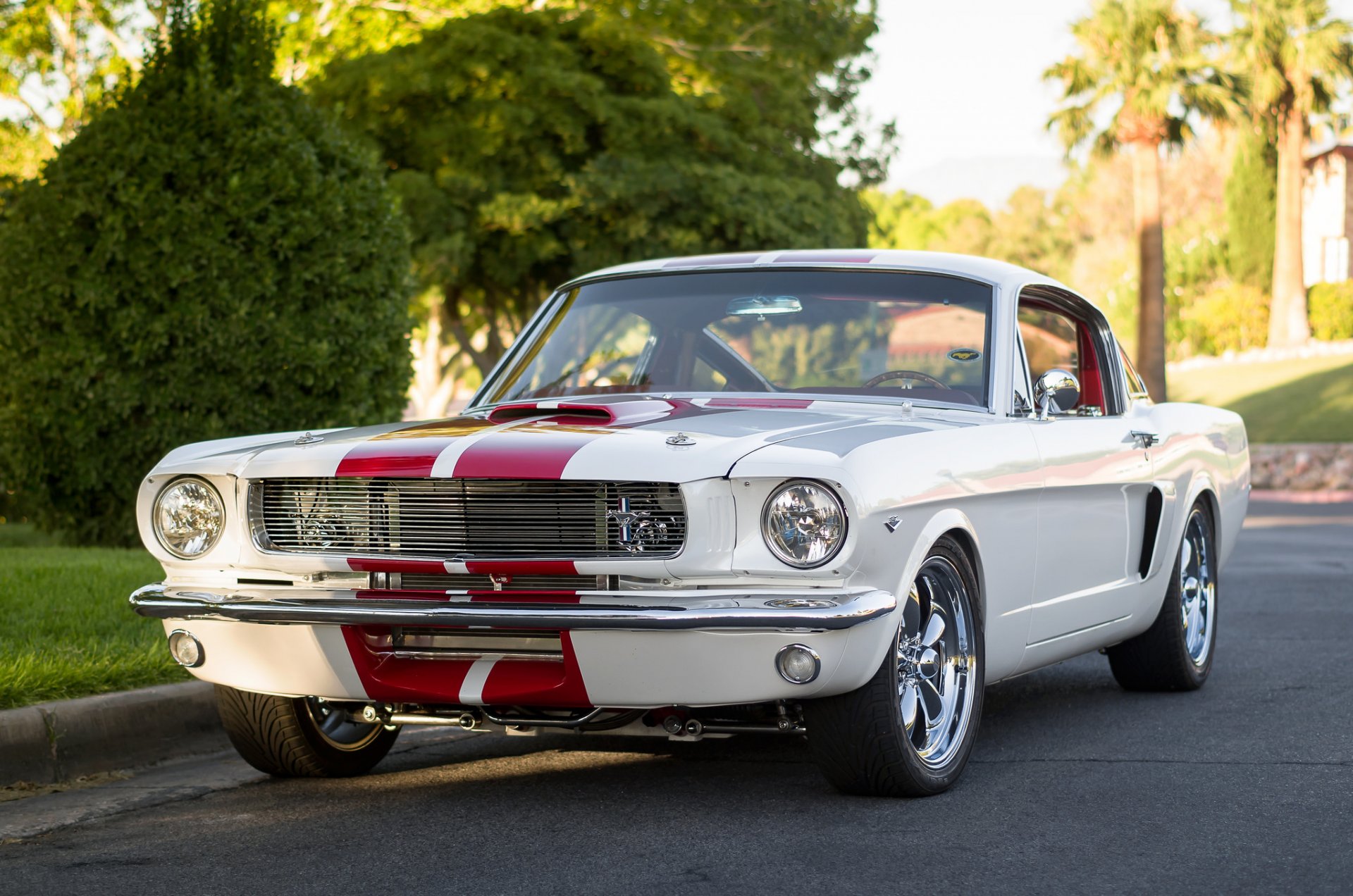 Weißer ford mustang mit rotem streifen am stoßfängerWeißer Ford Mustang mit rotem Streifen am Stoßfänger