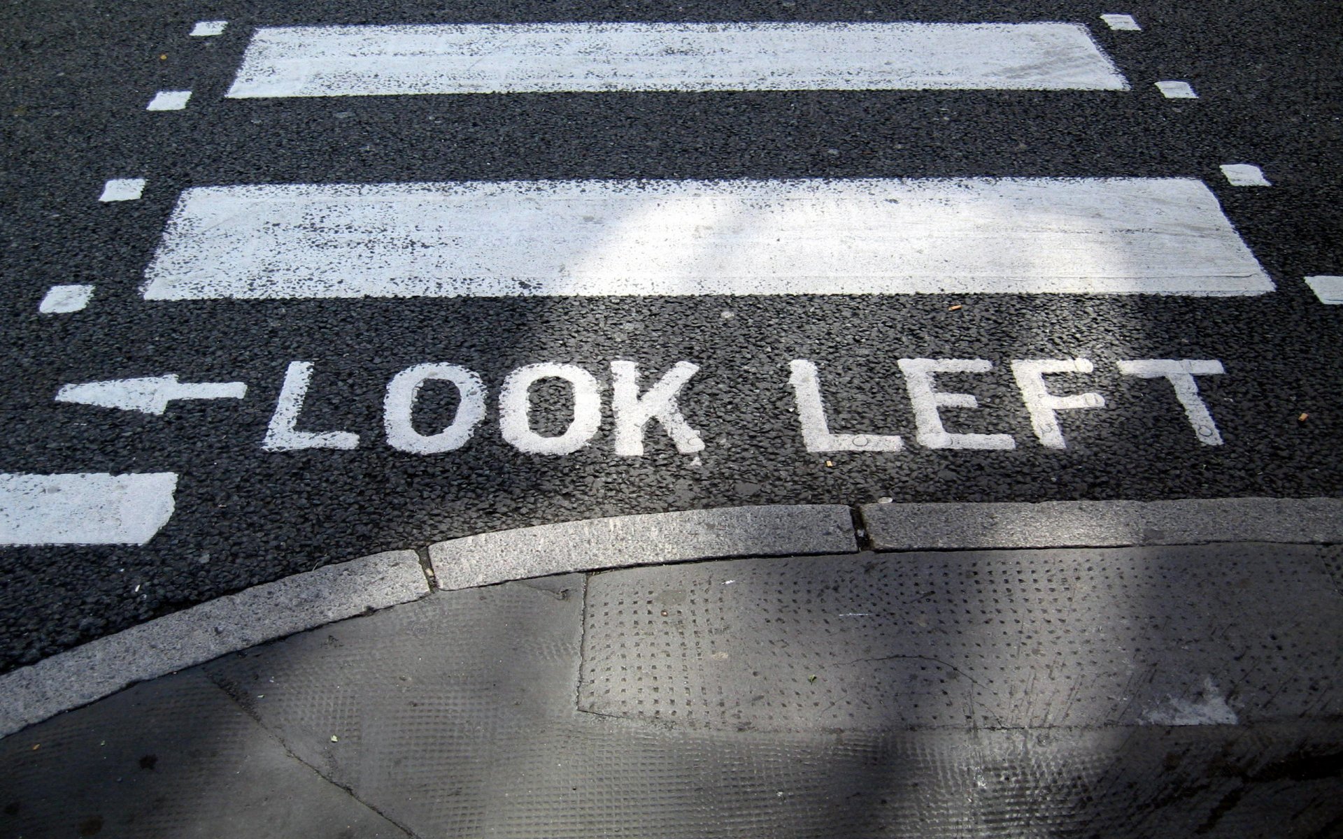Die englische Inschrift vor dem Fußgängerüberweg mit dem gezeichneten Pfeil und den Worten schau nach links