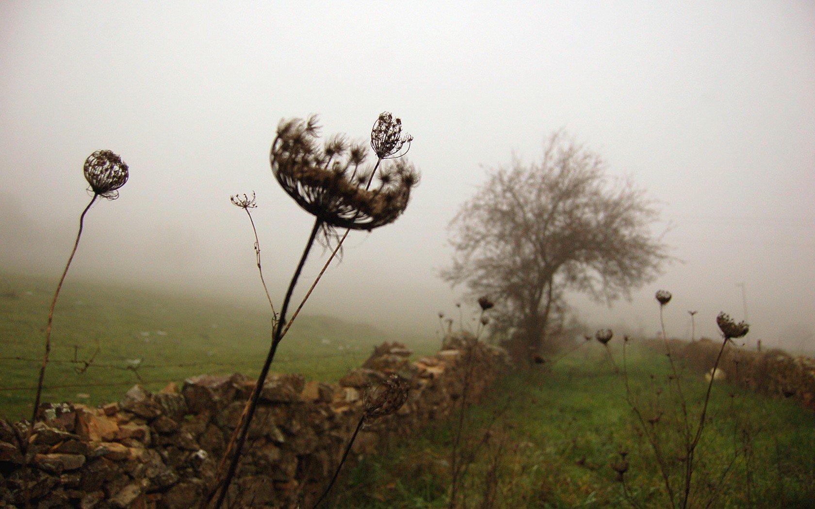Starker Nebel. Stein Zaun