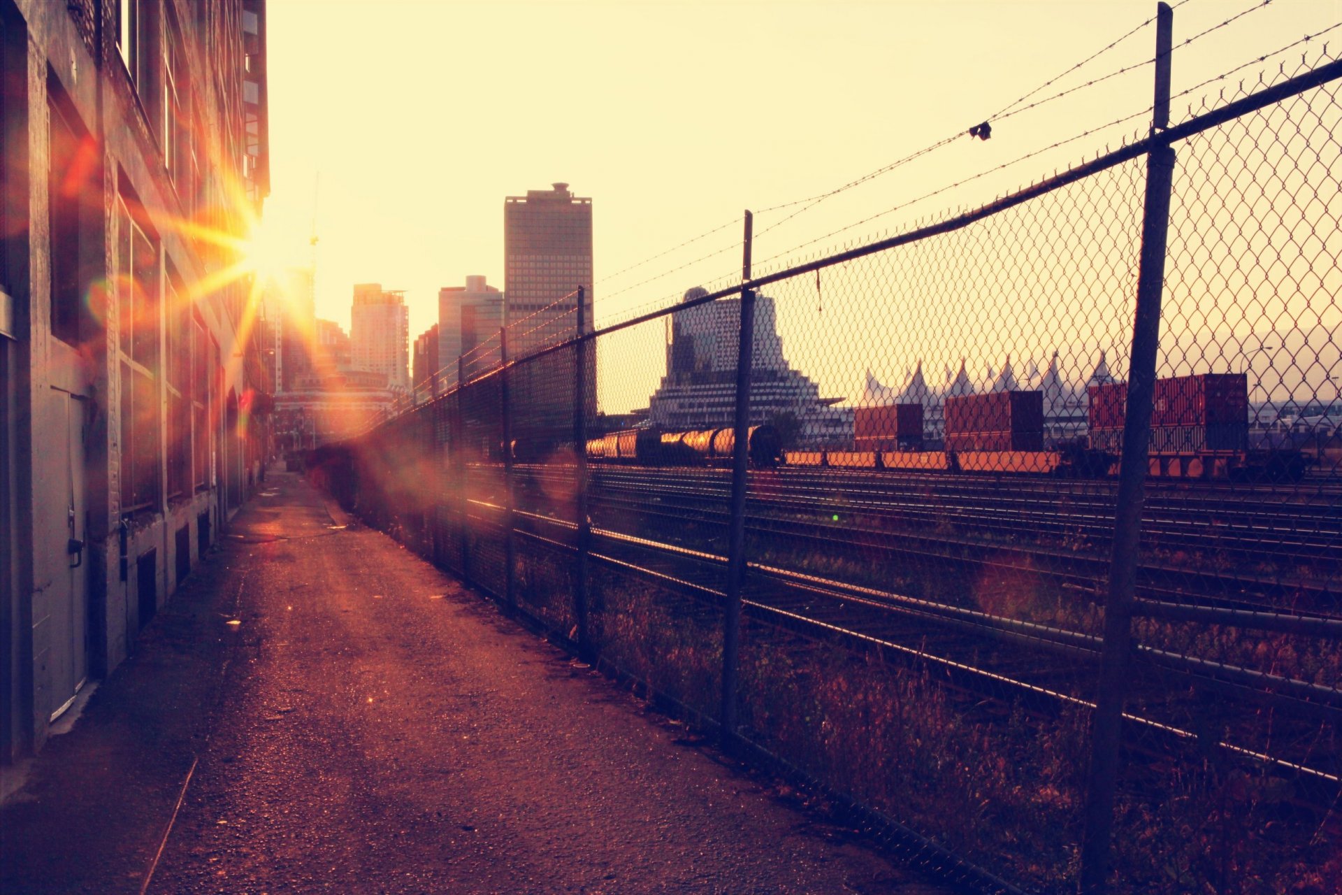 Ein Hund in einem Regenmantel spaziert am frühen nebeligen Morgen durch eine schöne Straße mit Laternen