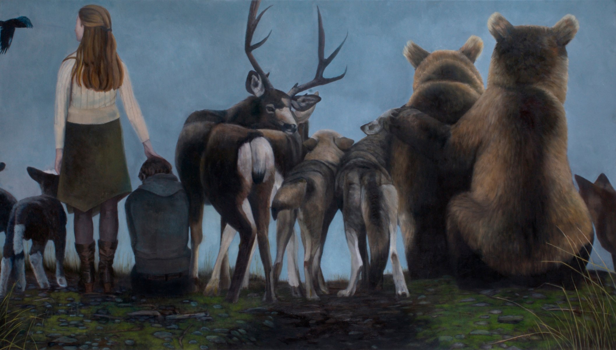 Mädchen mit jungen und tieren schauen in die ferneMädchen mit Jungen und Tieren schauen in die Ferne