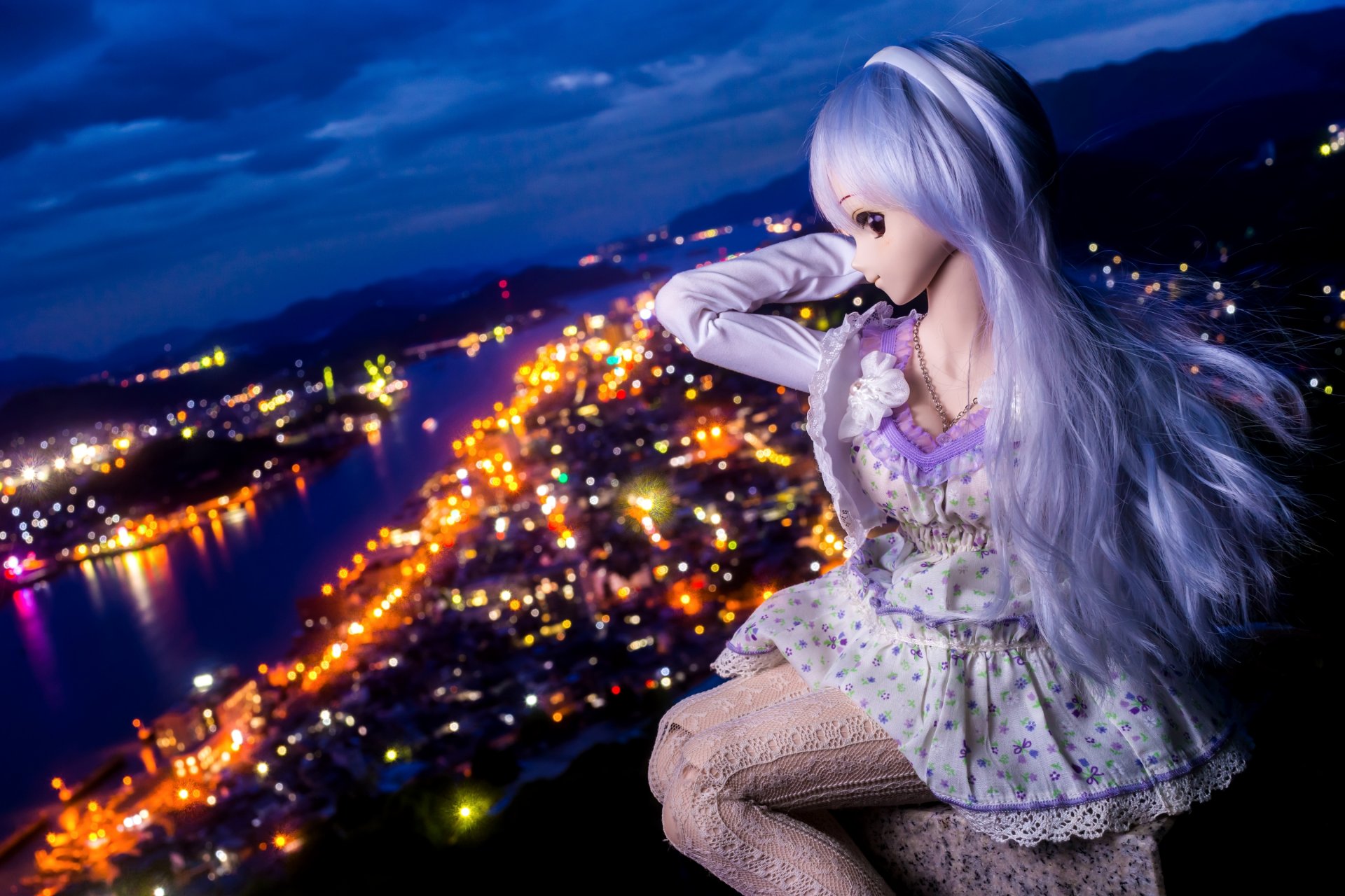 Eine Puppe im Anime-Stil über der Nachtstadt