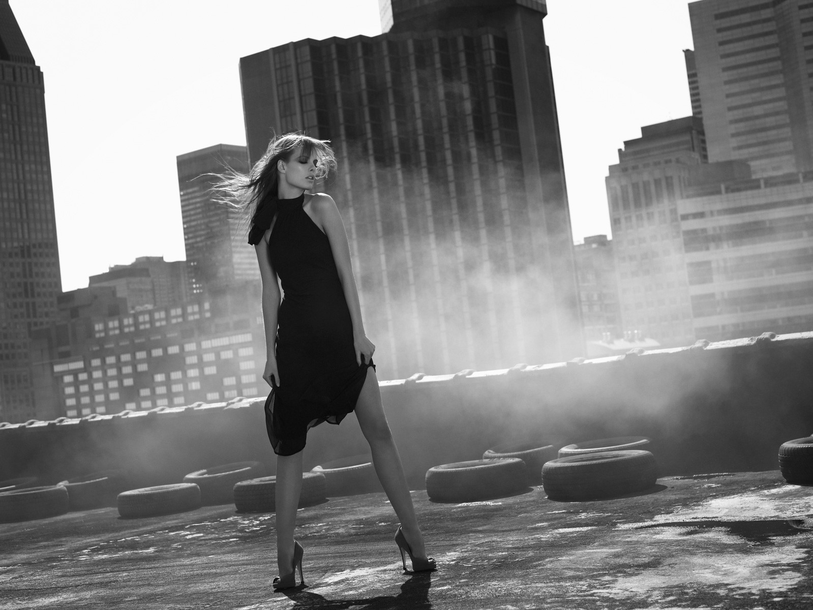 Mädchen auf dem Dach mit Rädern in der Stadt