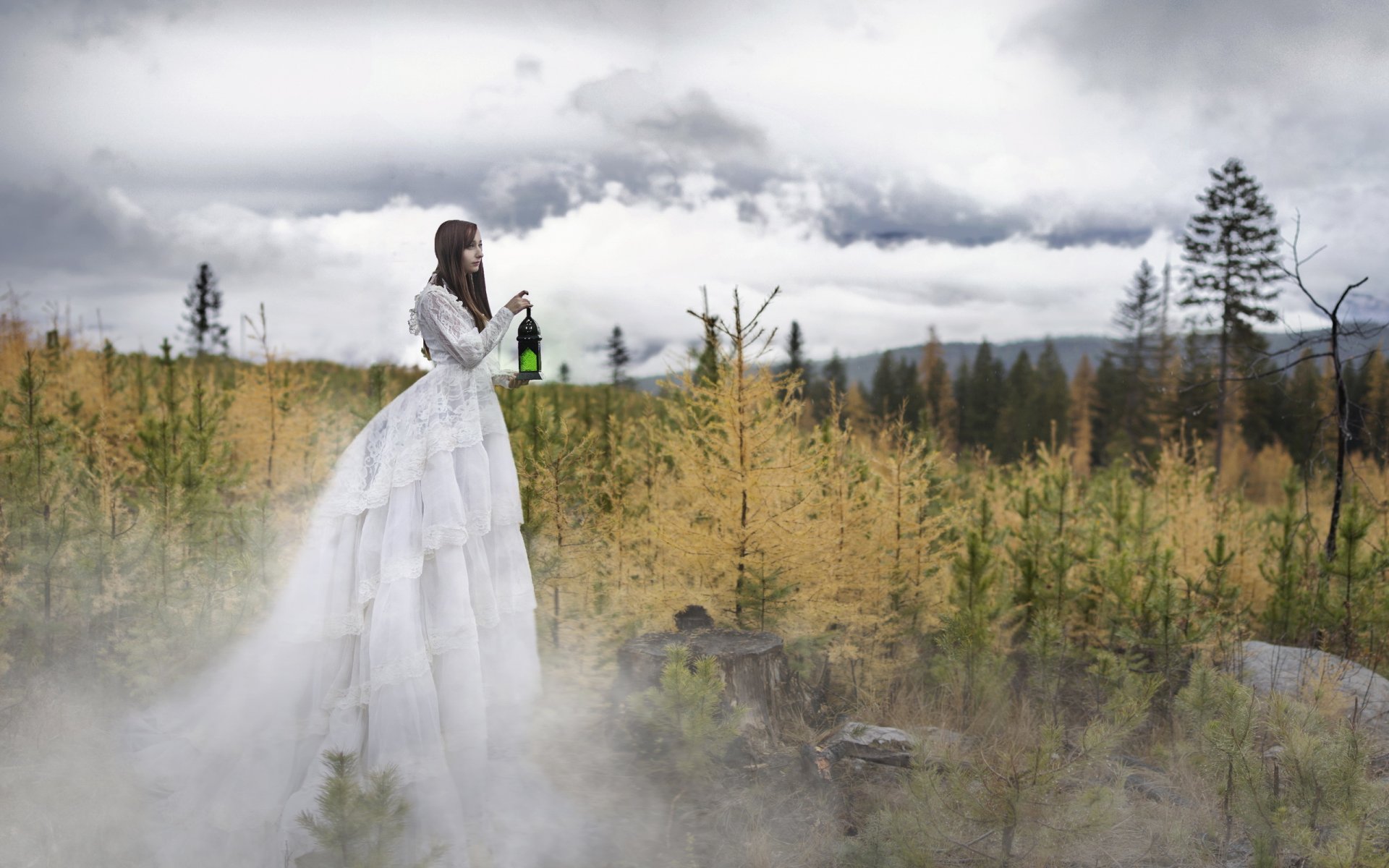 Die seele eines mädchens in einem rosa kleid, das sie in den dunklen wald ruftDie Seele eines Mädchens in einem rosa Kleid, das sie in den dunklen Wald ruft