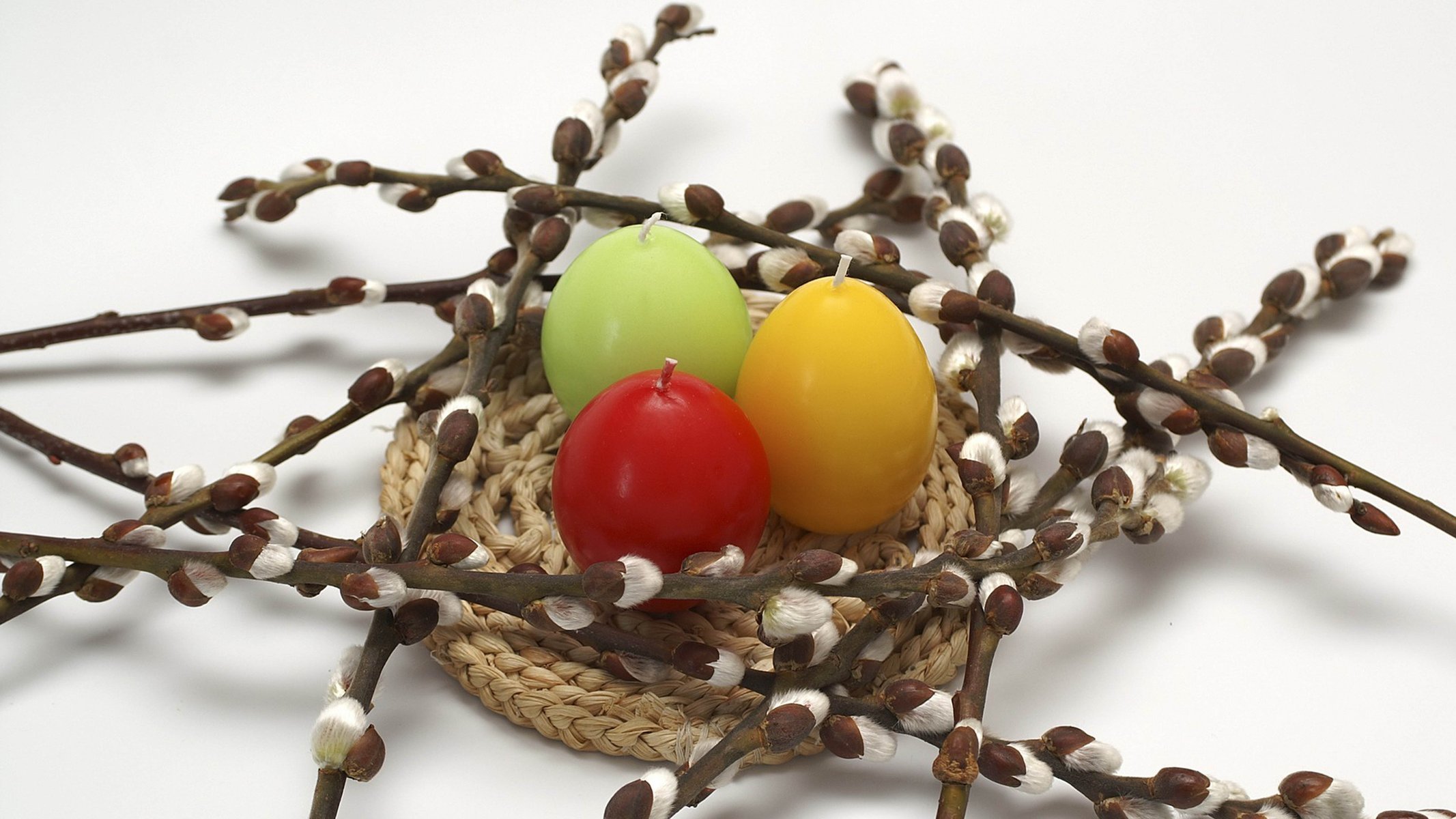 Hasenfiguren für das Osterfest mit gefärbten Eiern