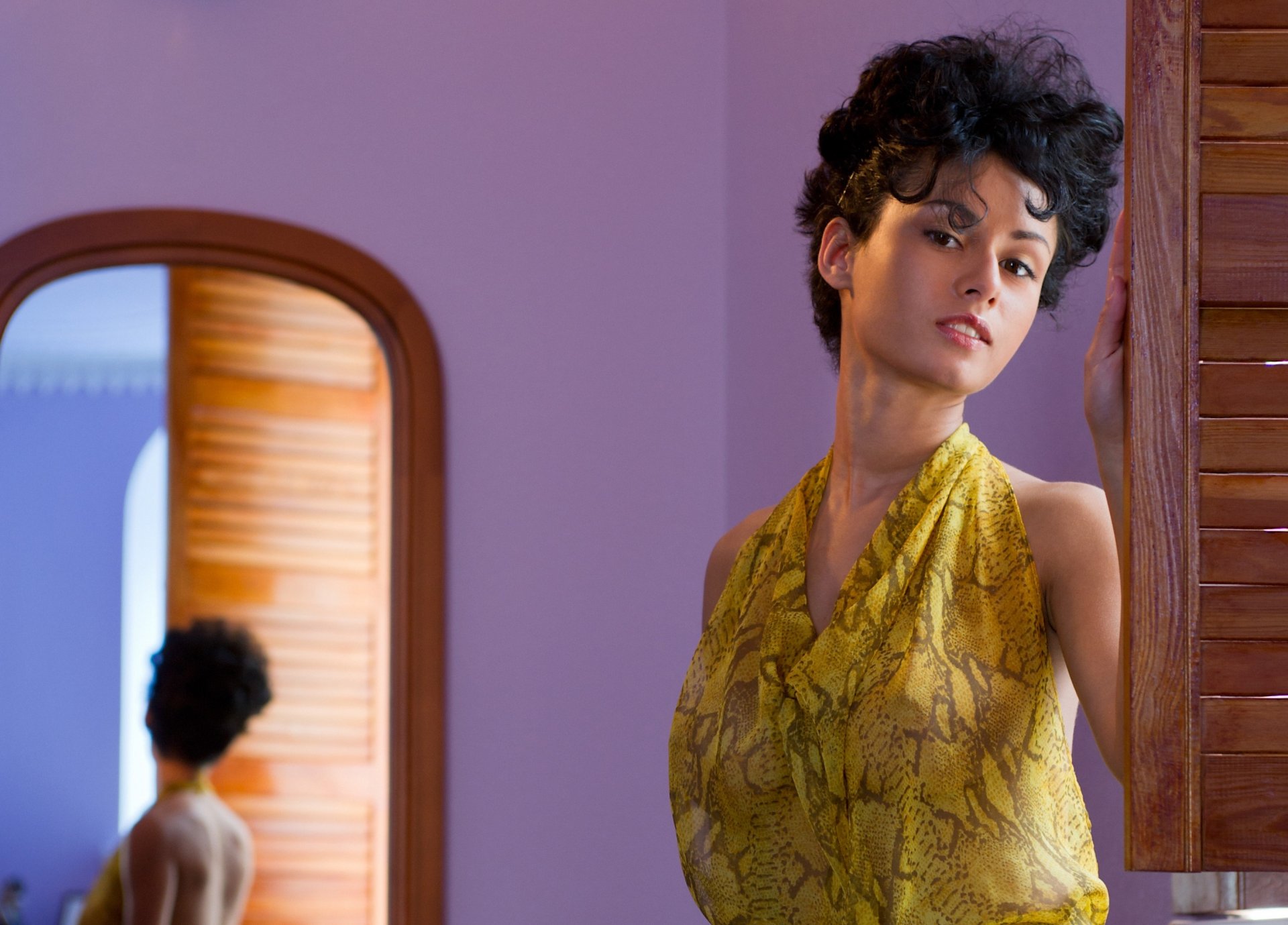 Pammie lee brünette mädchen mit locken blickt in den spiegelPammie lee Brünette Mädchen mit Locken blickt in den Spiegel