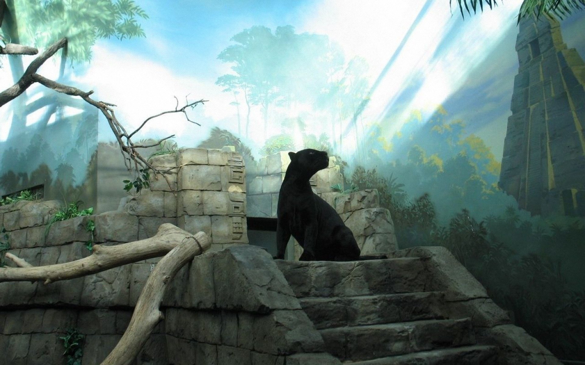 Ein schwarzer Panther sitzt in Trümmern auf einer Treppe