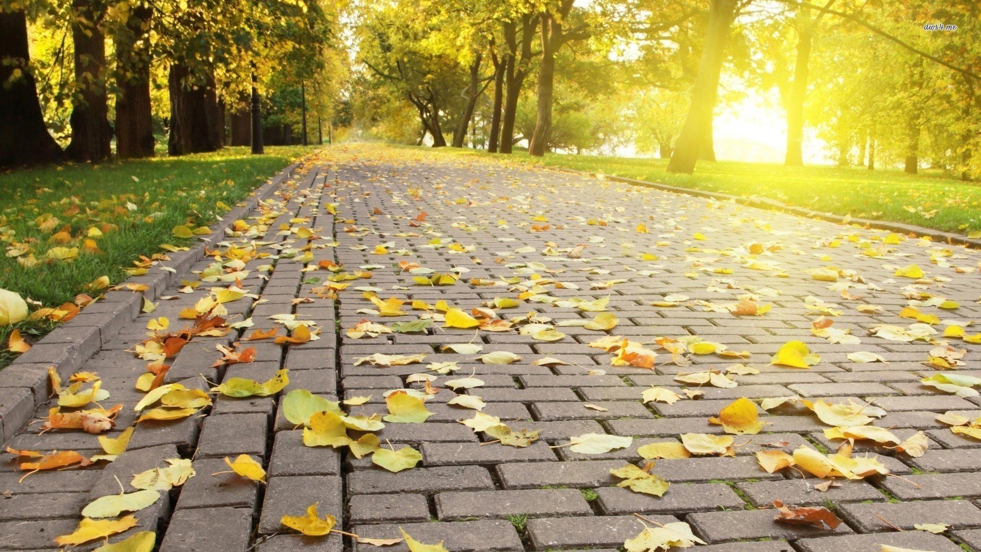 Park mit Bänken unter einem bewölkten Sonnenuntergang