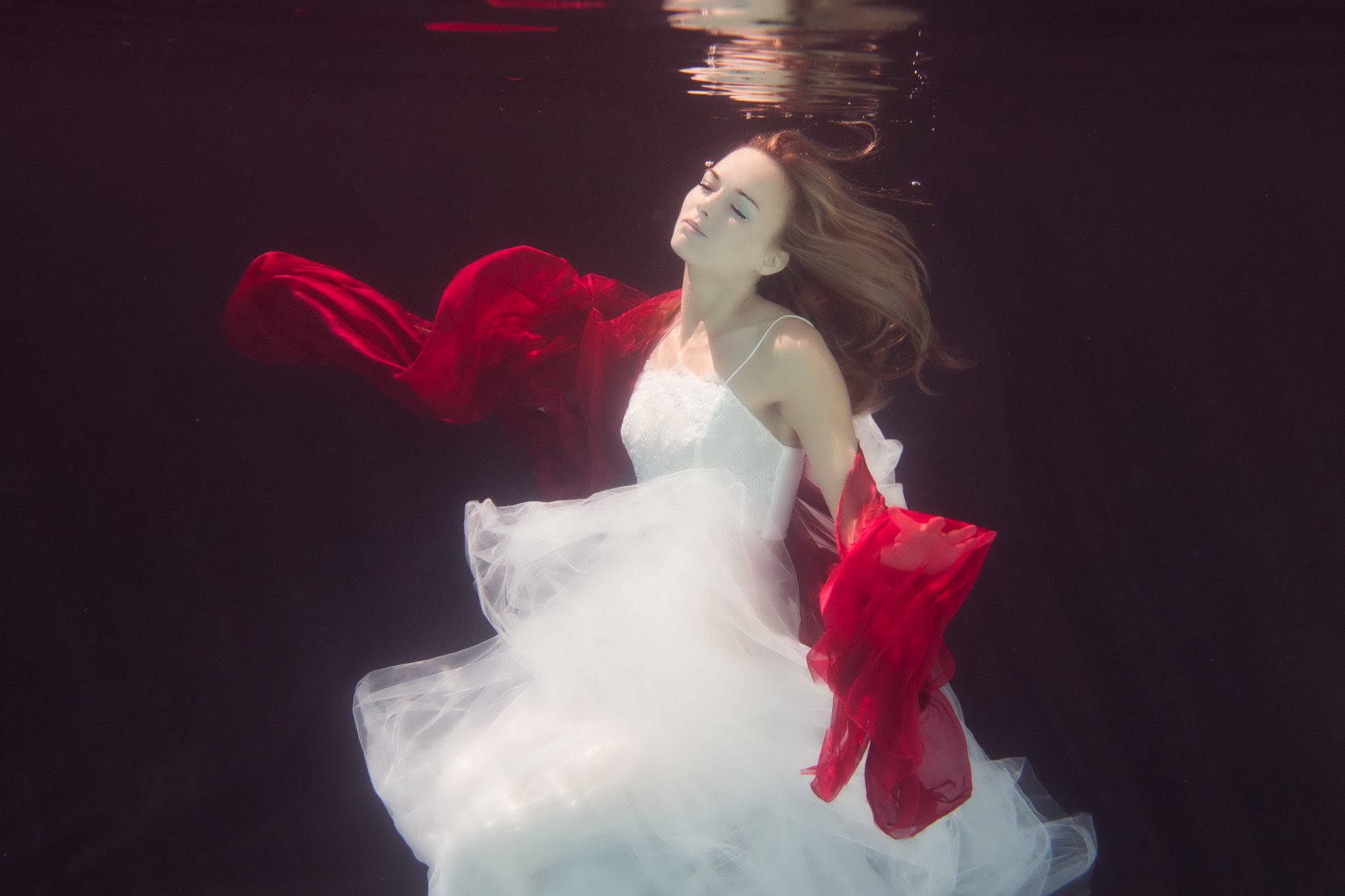 Mädchen im weißen kleid mit rotem schal unter wasserMädchen im weißen Kleid mit rotem Schal unter Wasser