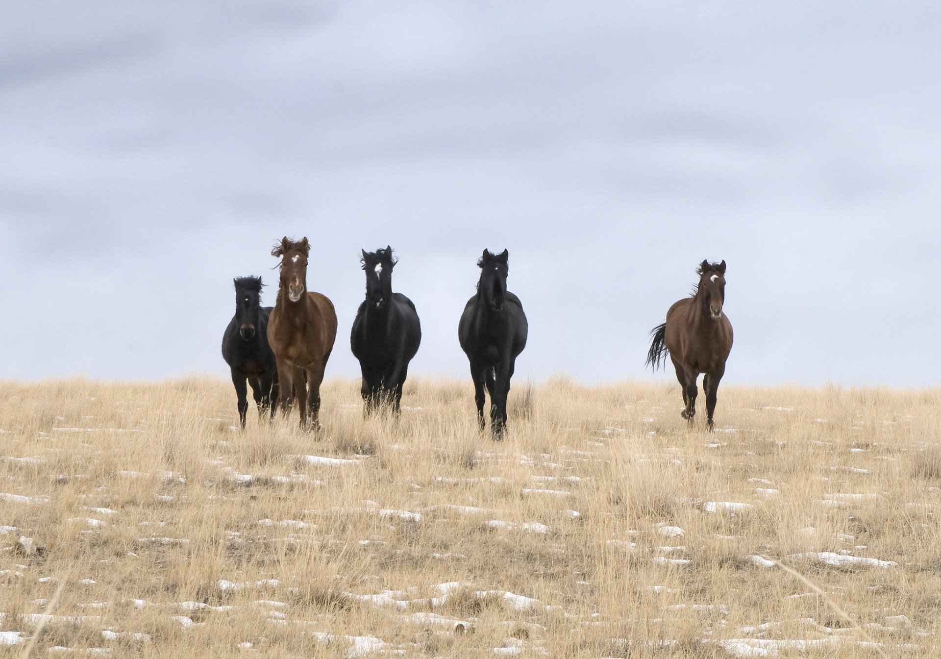 Zwei dunkle Pferde auf einem schneebedeckten Feld