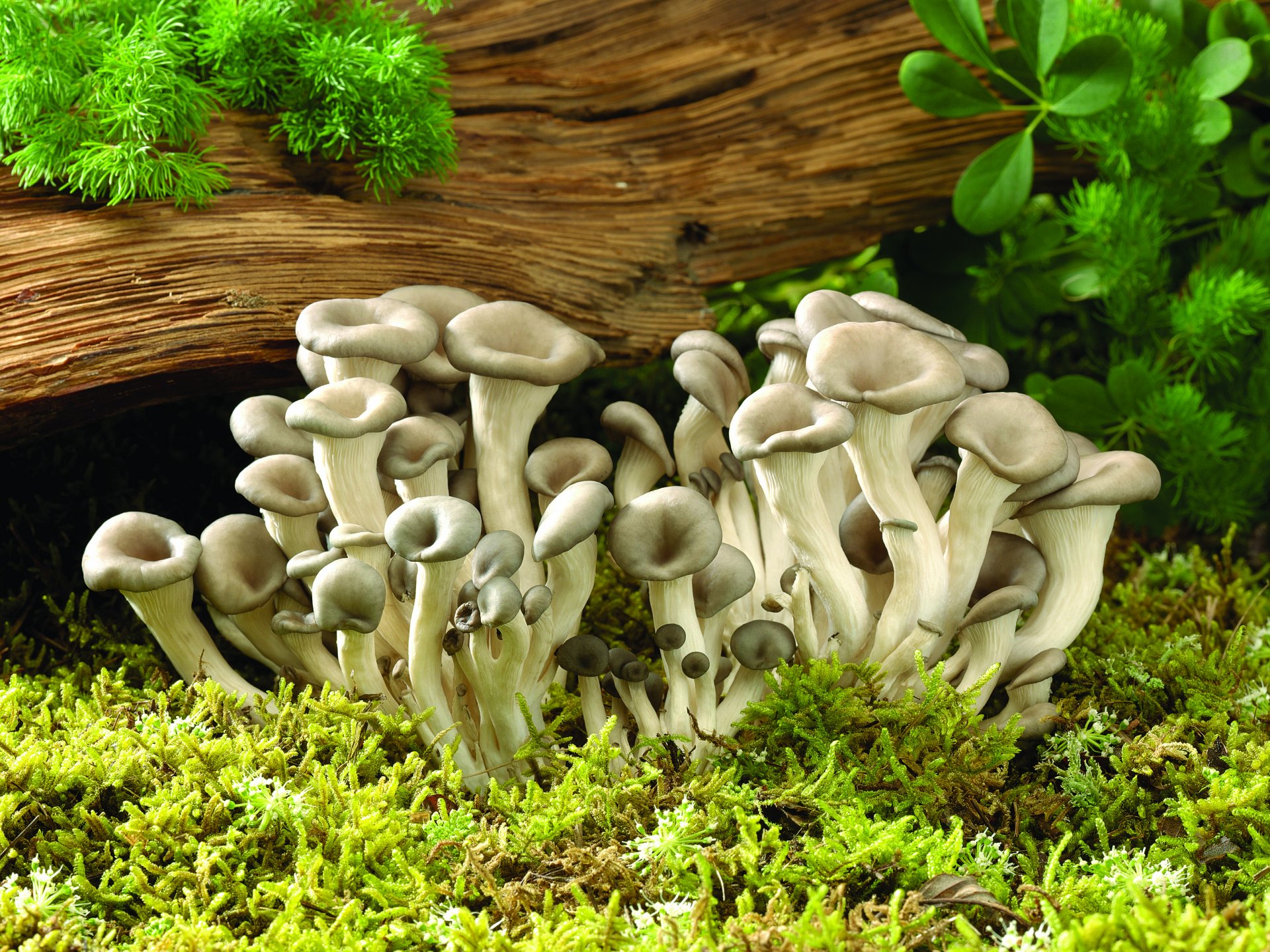 Ein weißer Pilz steht in grünem Moos, auf dem Pilz liegt ein trockenes Blatt, auf einem verschwommenen grünen Hintergrund
