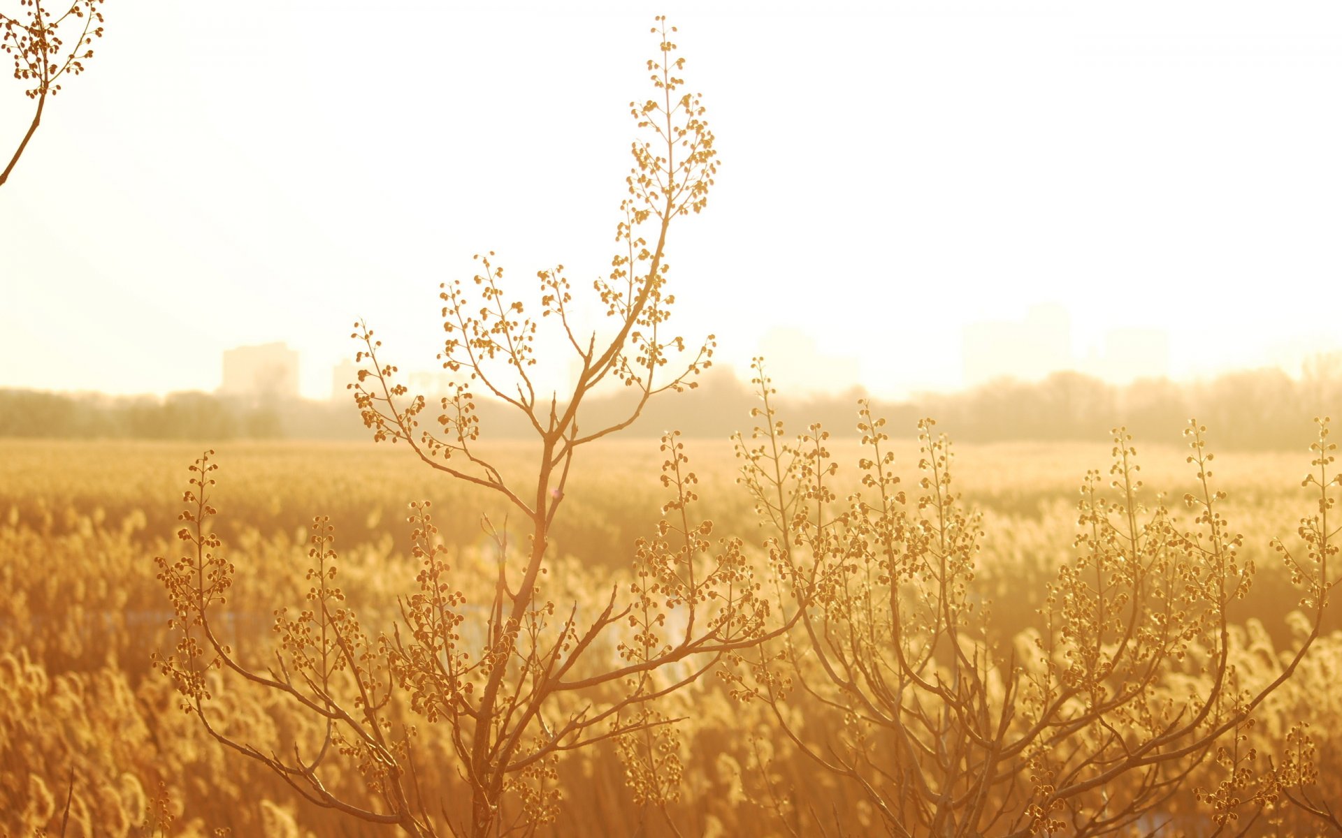 Verschwommenes Foto der Pflanze und zwei helle Früchte. Helle Früchte Pflanzen Foto