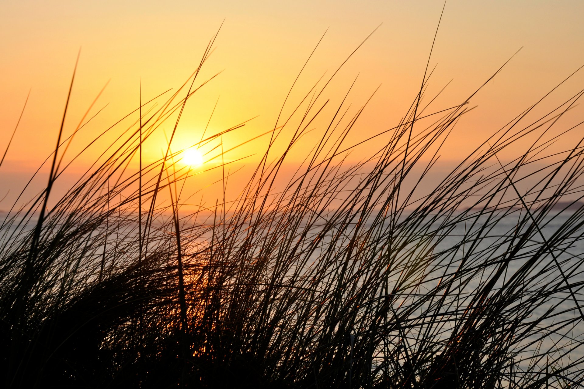 Bei Sonnenuntergang Wasser und Gras im Hintergrund