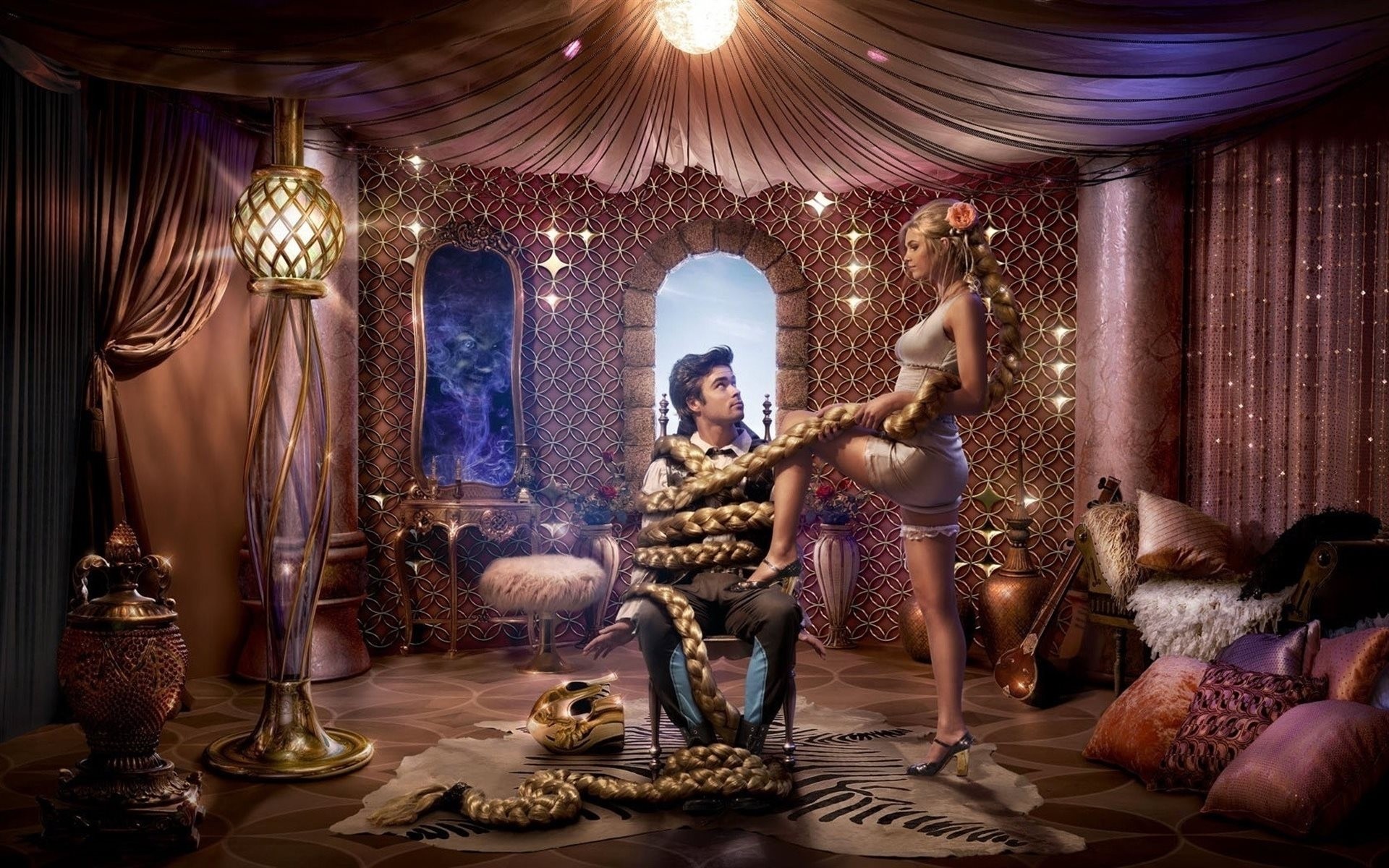 Ein mann, der an den stuhl eines langen, schrägen mädchens gebunden istEin Mann, der an den Stuhl eines langen, schrägen Mädchens gebunden ist