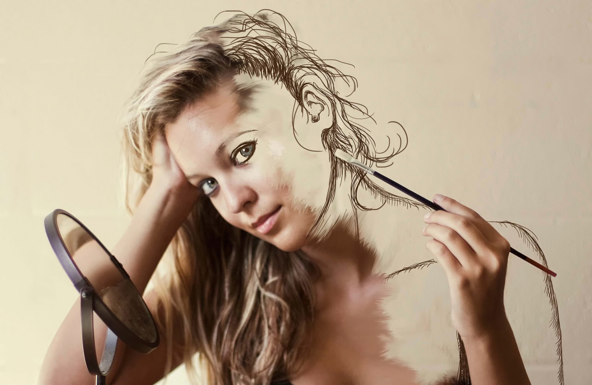 Das mädchen malt sich selbst mit einem pinsel und schaut in den spiegelDas Mädchen malt sich selbst mit einem Pinsel und schaut in den Spiegel