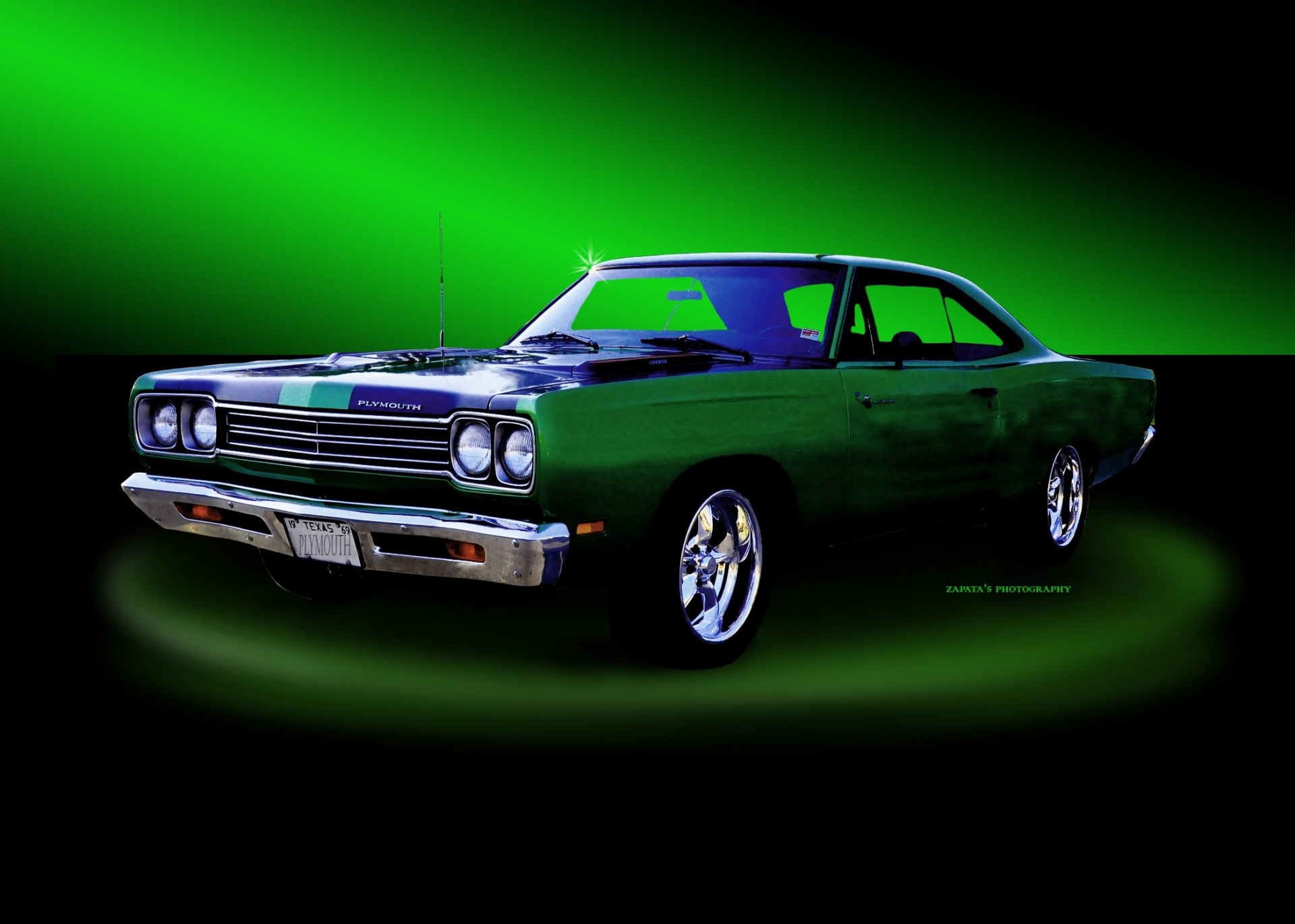 Grün-schwarzes Cabrio wird vor dem Hintergrund des Tores angenommen