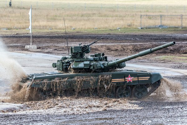 Der Tank t-90 fährt auf dem Gelände durch den Schlamm