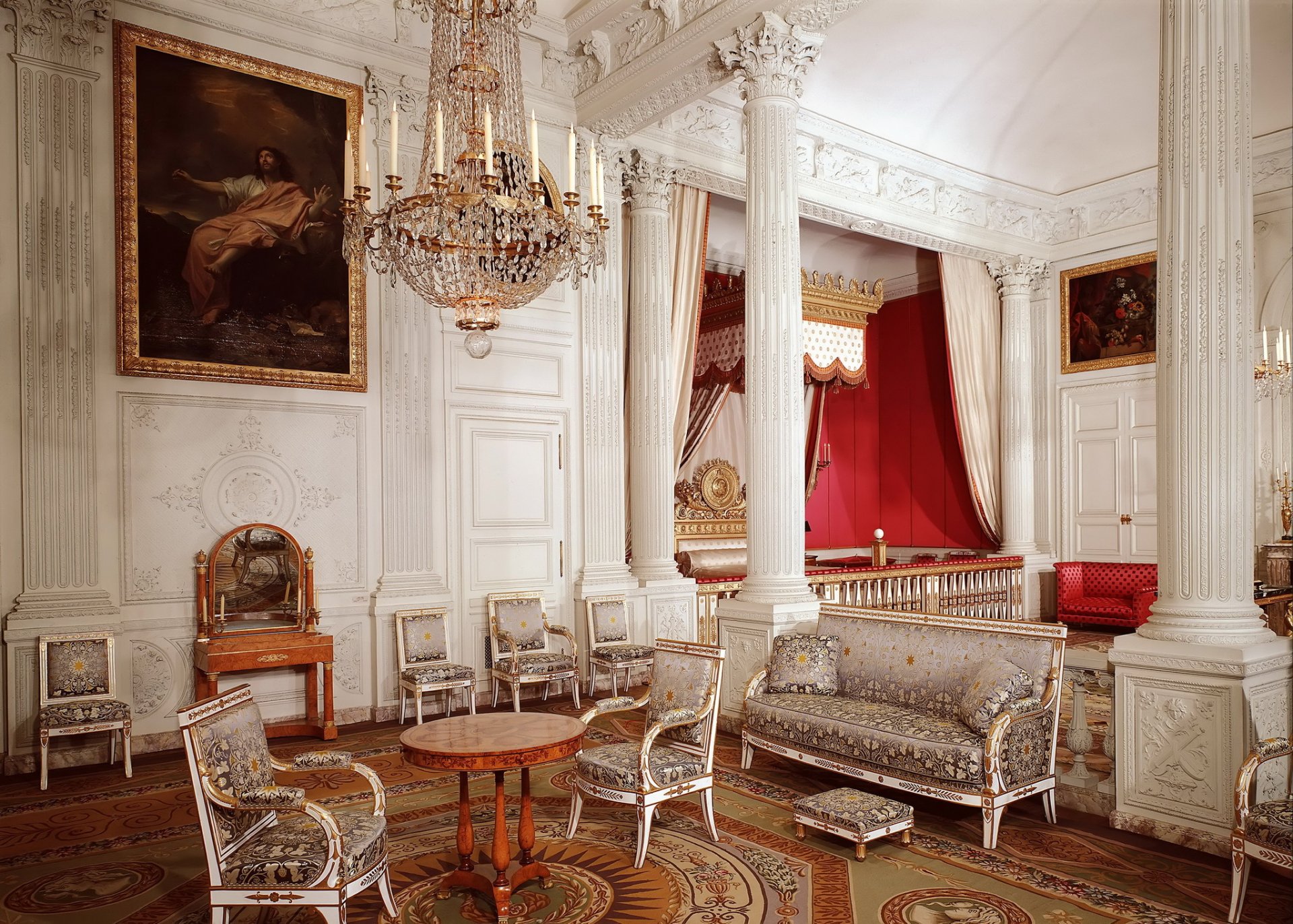 Venezianisches Interieur mit einem majestätischen Innenraum, bestehend aus einem atemberaubenden Kronleuchter, malerischen Bildern, monolithischen Säulen