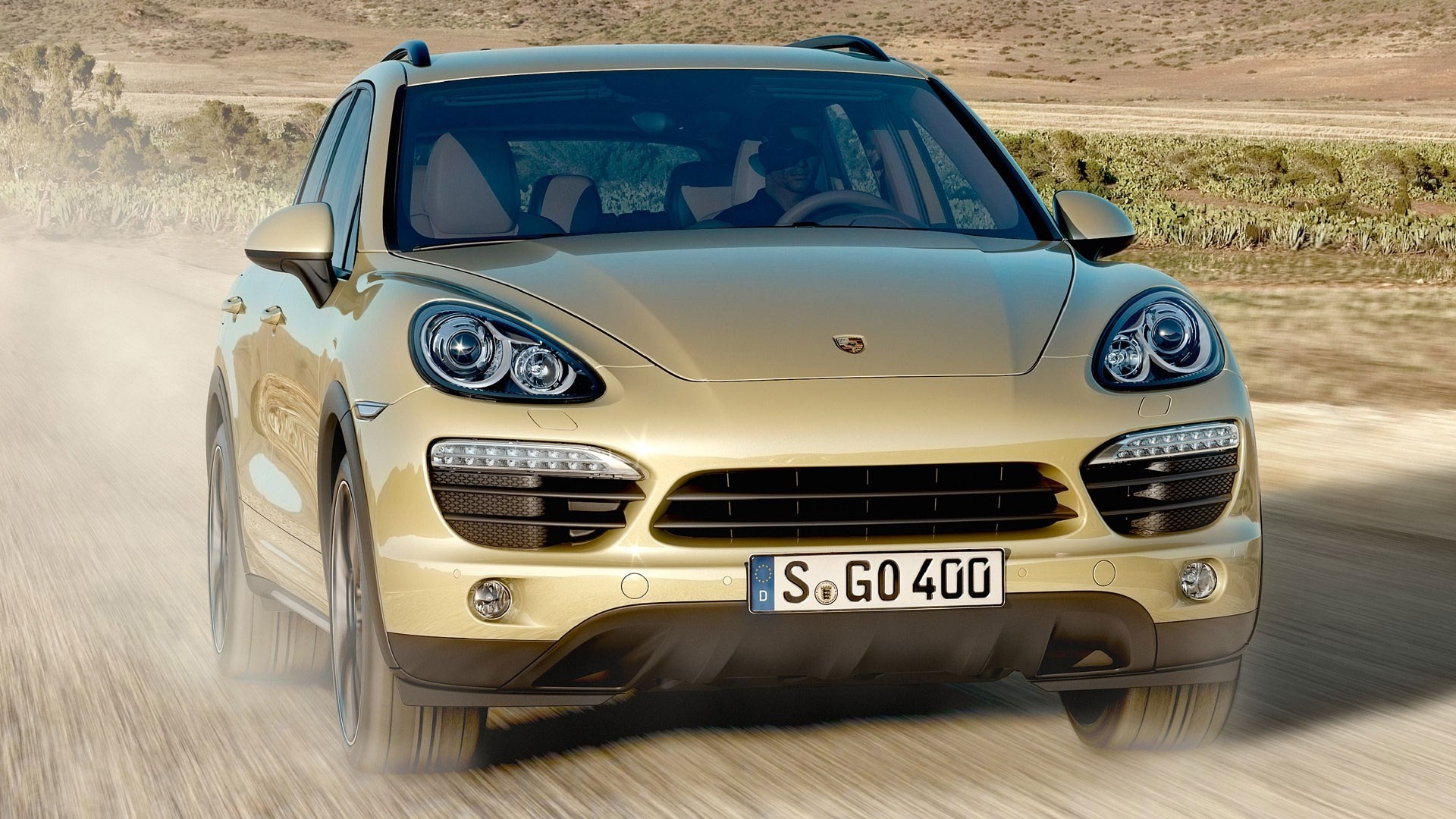 Schwarzer Porsche Cayenne fährt in der Wüste über den Sand