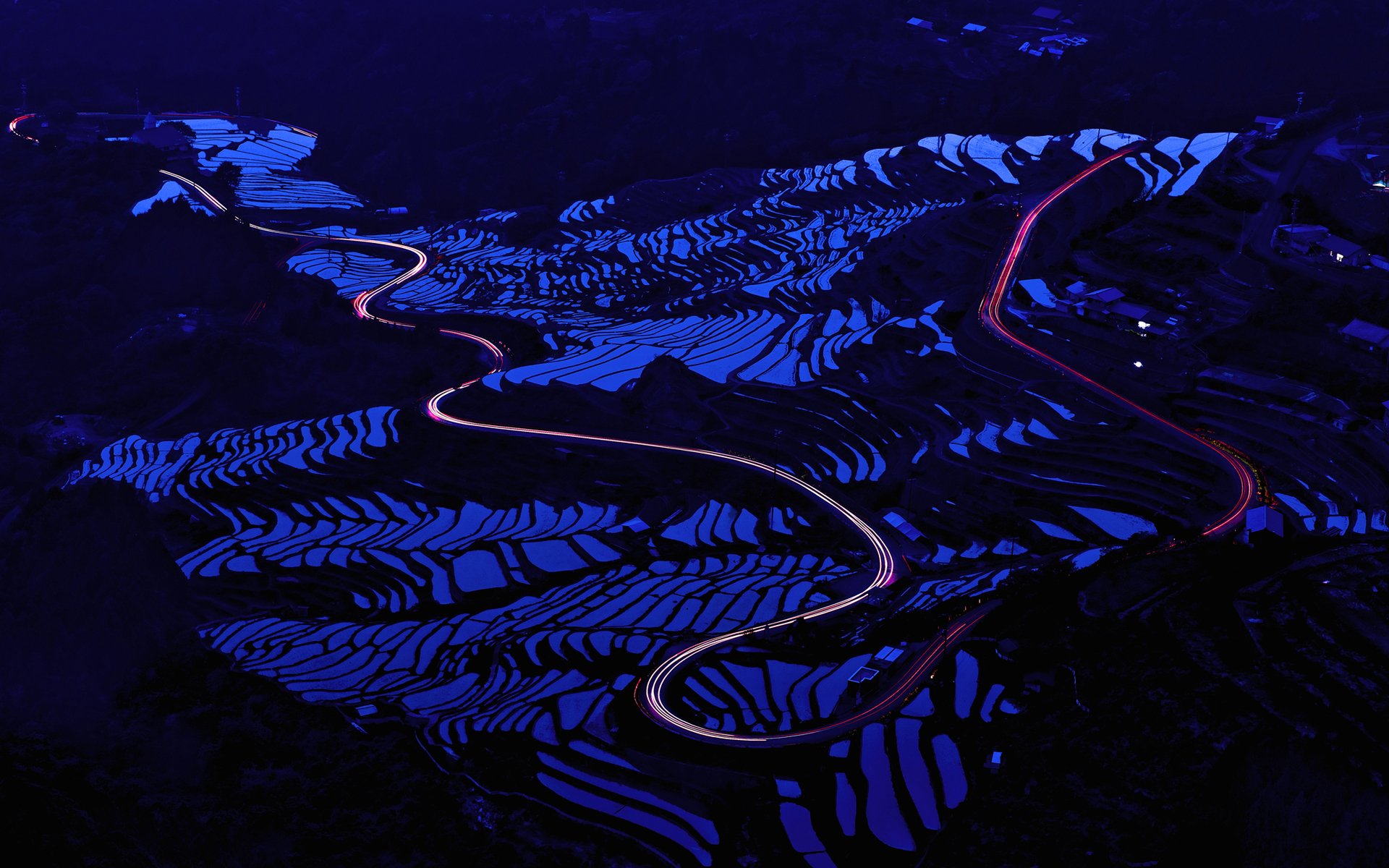 Lichter der stadt in einer verschneiten nacht auf dem hintergrund des berges hinter dem mondLichter der Stadt in einer verschneiten Nacht auf dem Hintergrund des Berges hinter dem Mond