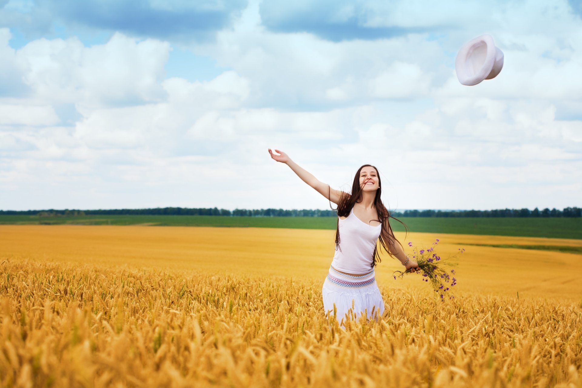 Glückliches Mädchen in weiß auf goldenem Weizen Hintergrund