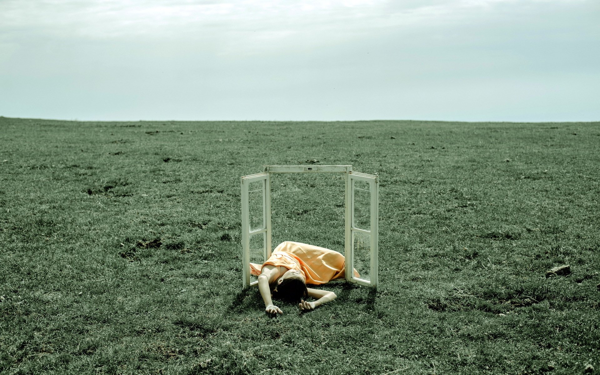 Art house Foto, geöffnete Fensterläden im Feld mit dem Mädchen darin