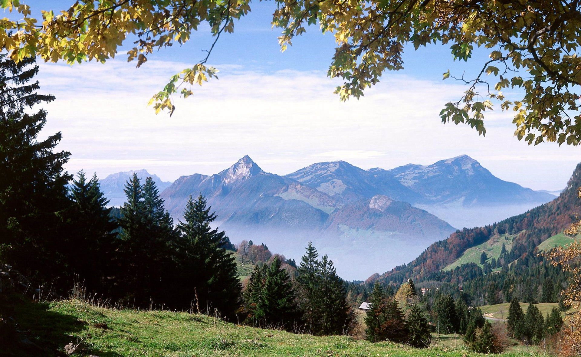 Hügel und berge vor dem hintergrund einer nebligen lichtungHügel und Berge vor dem Hintergrund einer nebligen Lichtung