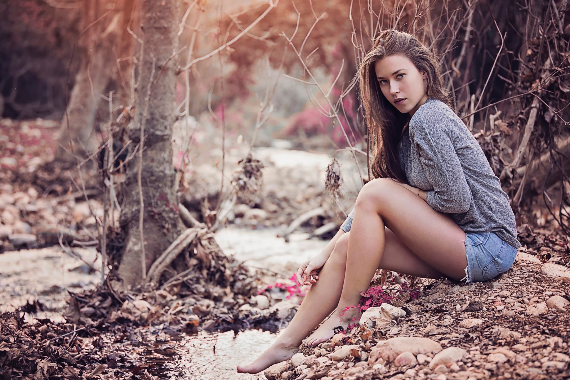 Mädchen mit frechen brüsten und kurzen shorts sitztMädchen mit frechen Brüsten und kurzen Shorts sitzt