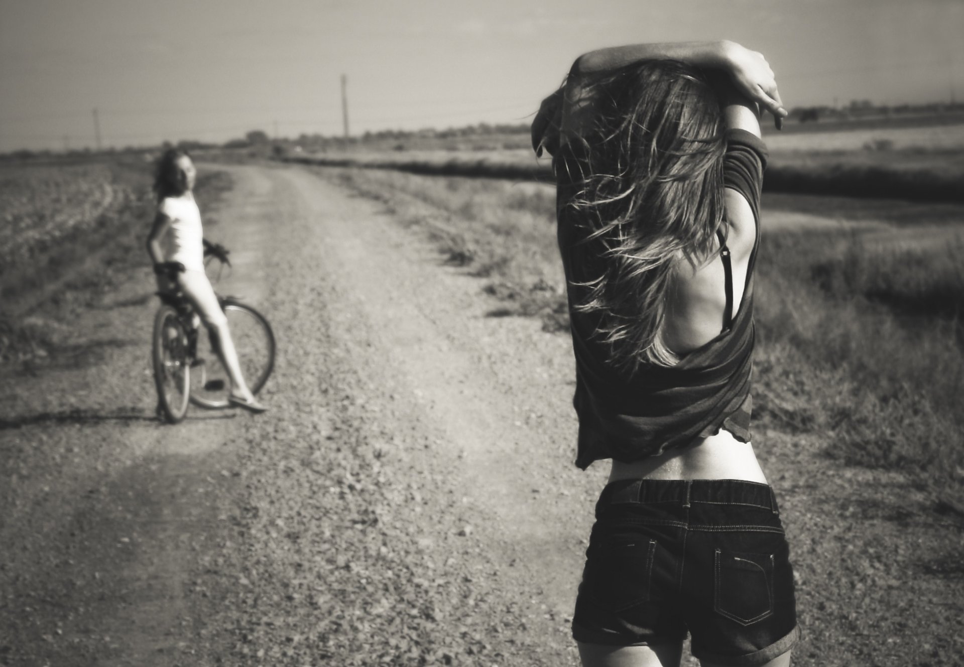 Schwarz-weiß-foto eines mädchens im sommer in shortsSchwarz-Weiß-Foto eines Mädchens im Sommer in Shorts