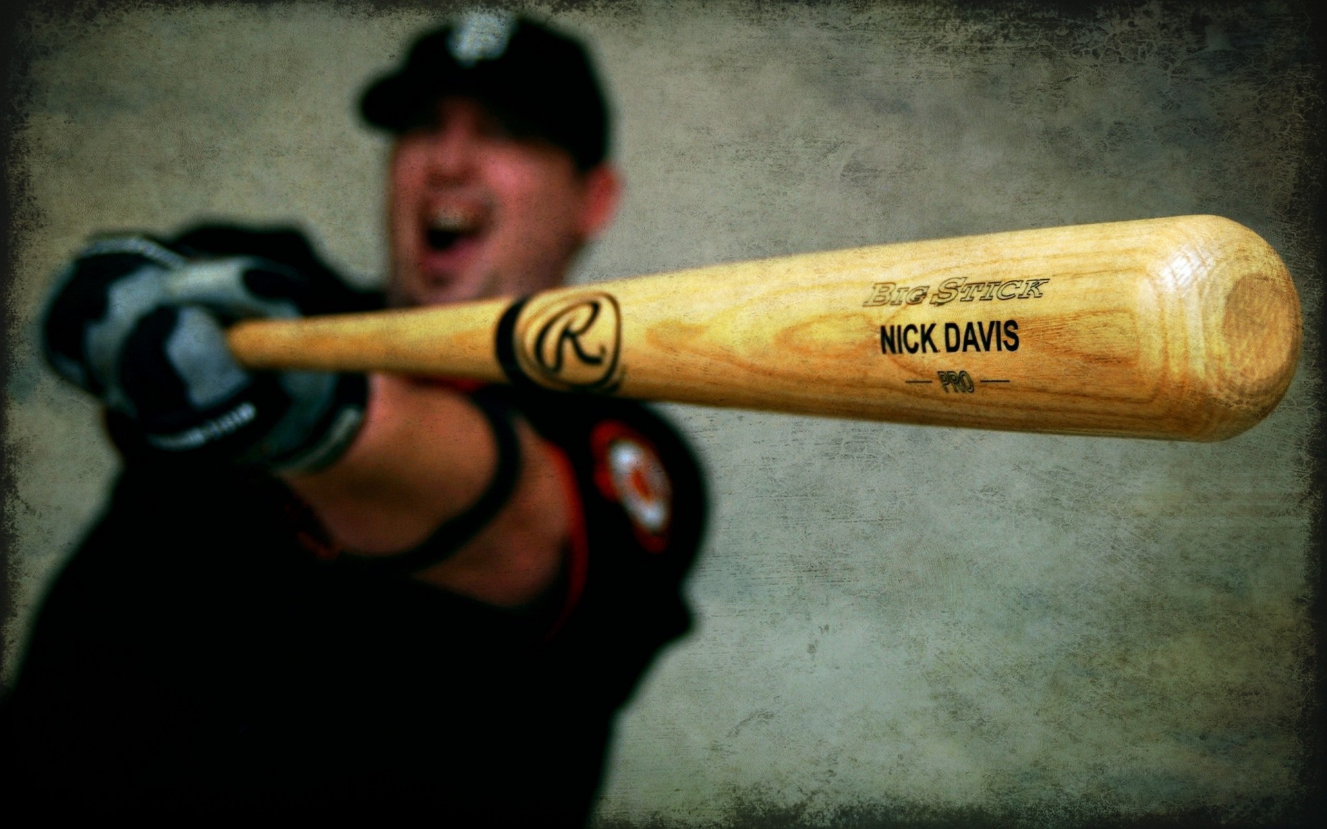 Mann mit einem fledermaus mit offenem mund auf wandhintergrundMann mit einem Fledermaus mit offenem Mund auf Wandhintergrund