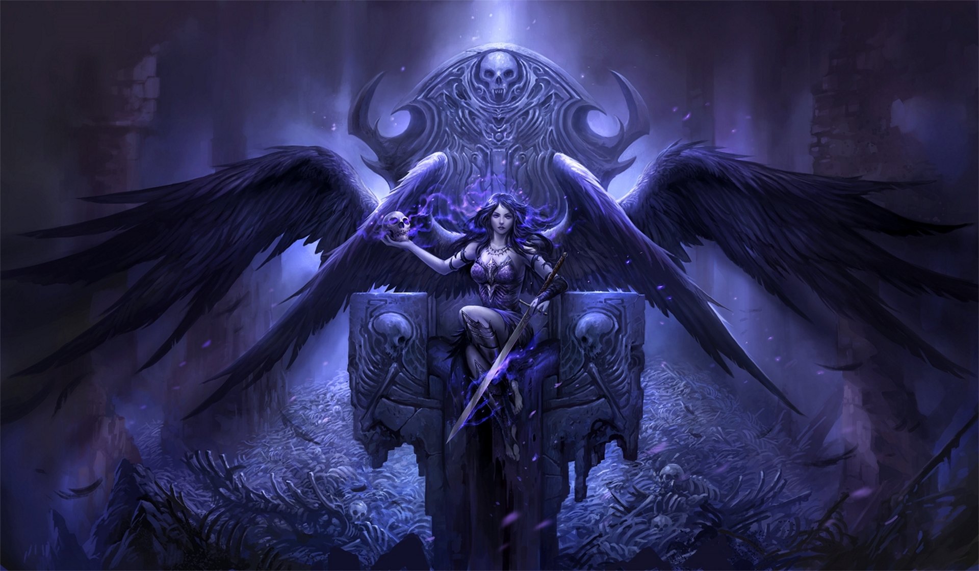 Mädchen Engel auf dem Thron mit Skelett und Knochen