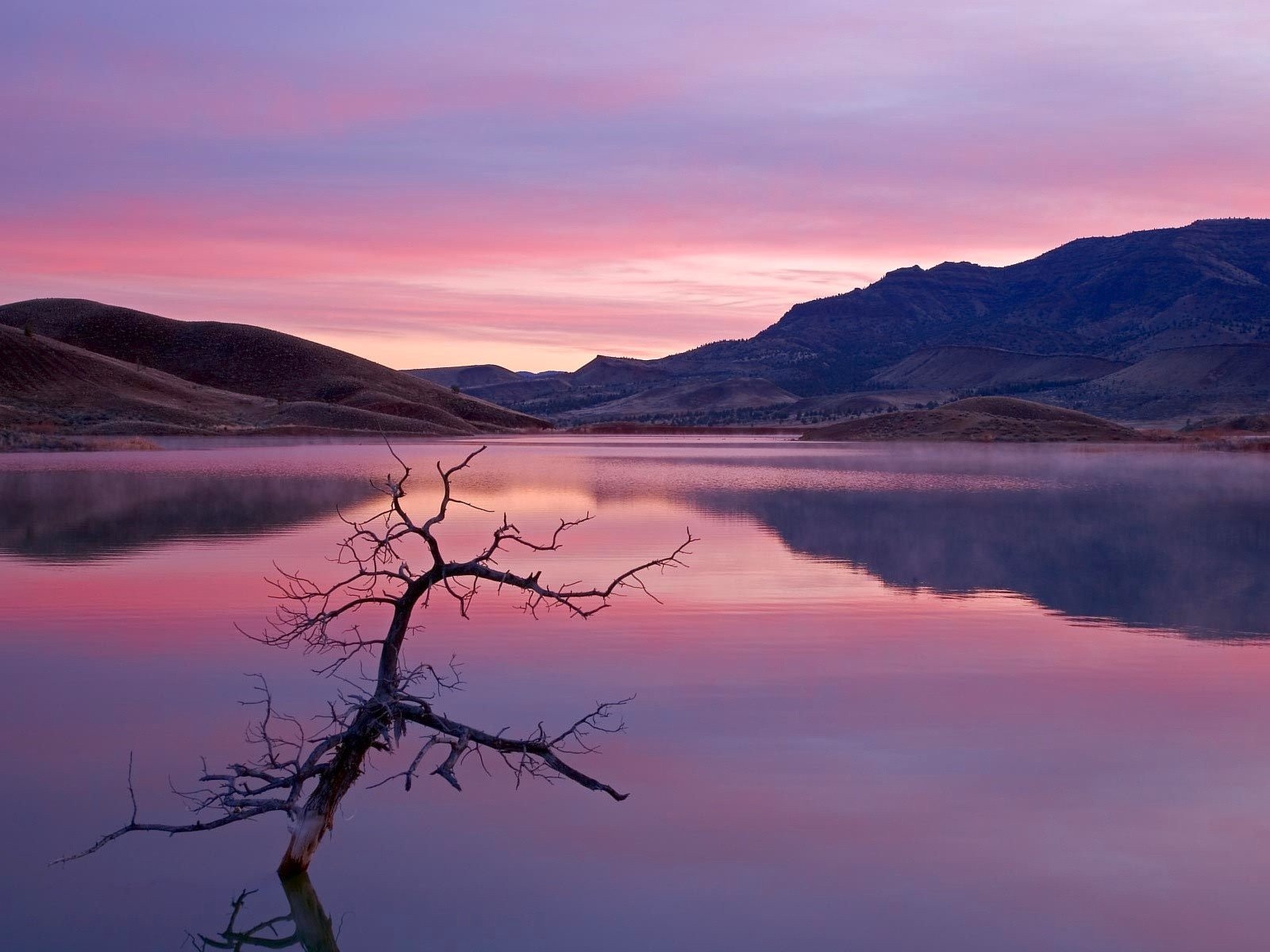 Reflexion eines zweigs in der rosa oberfläche des wassersReflexion eines Zweigs in der rosa Oberfläche des Wassers
