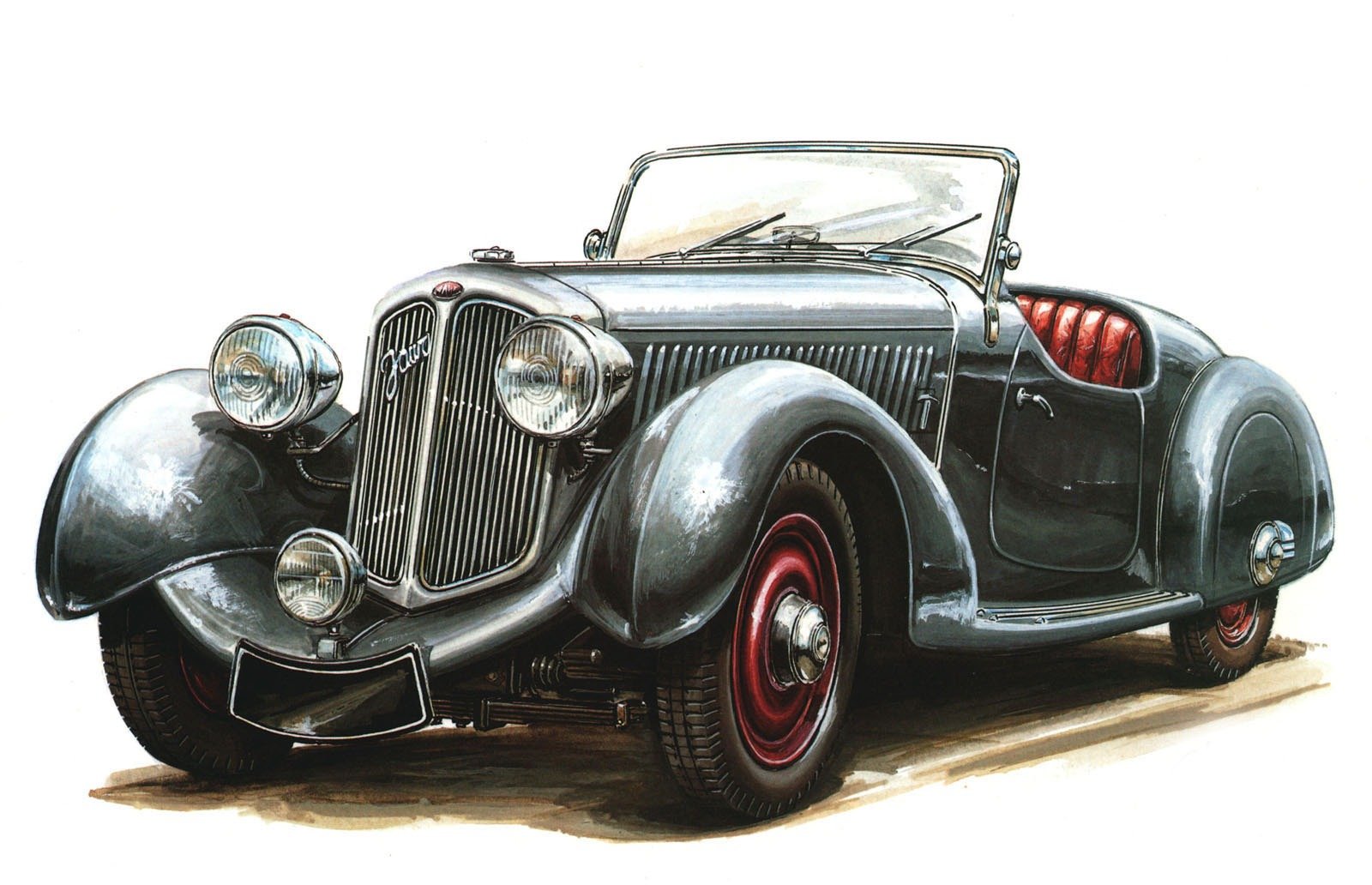 Grünes retro-auto mit einer spielzeugkopie von sich selbst auf dem spiegelGrünes Retro-Auto mit einer Spielzeugkopie von sich selbst auf dem Spiegel
