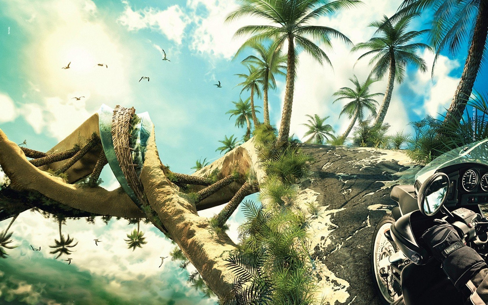 Inmitten von bäumen und strahlender sonne steht ein motorradInmitten von Bäumen und strahlender Sonne steht ein Motorrad