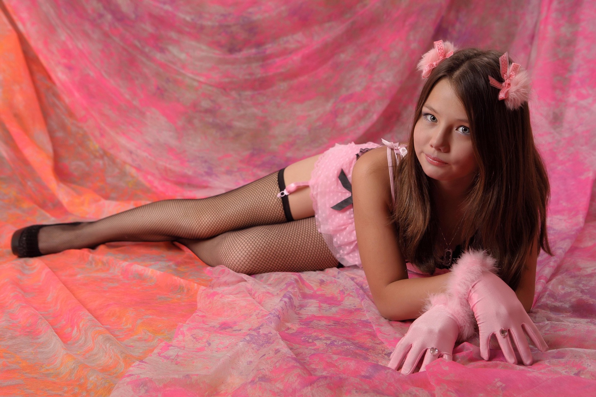 Rosa vid, teen liegt mit gebeugten beinen in heels in dessous und strümpfenRosa vid, teen liegt mit gebeugten Beinen in Heels in Dessous und Strümpfen