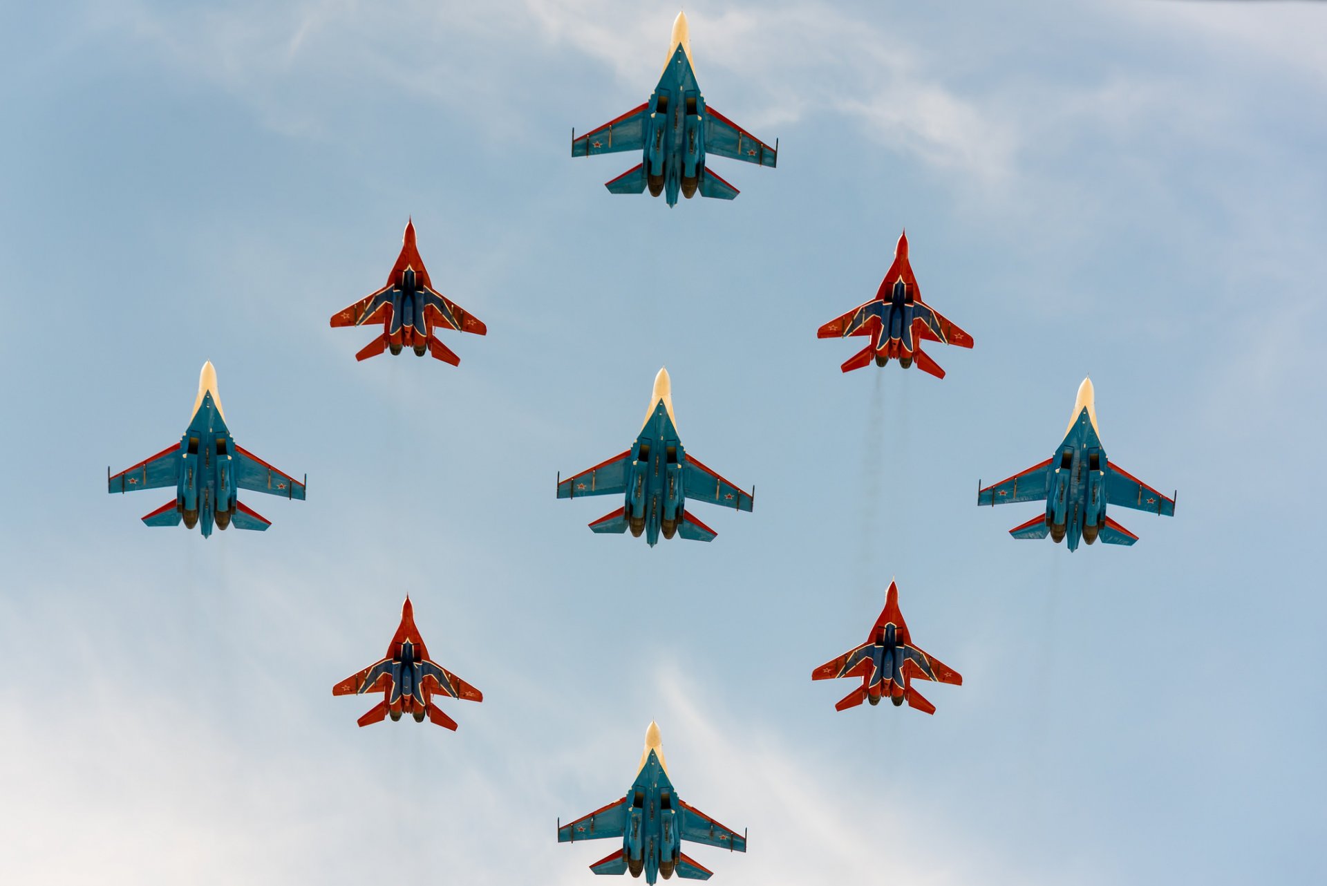 Vier russische SC-27-Kampfjets fliegen mit einem Keil