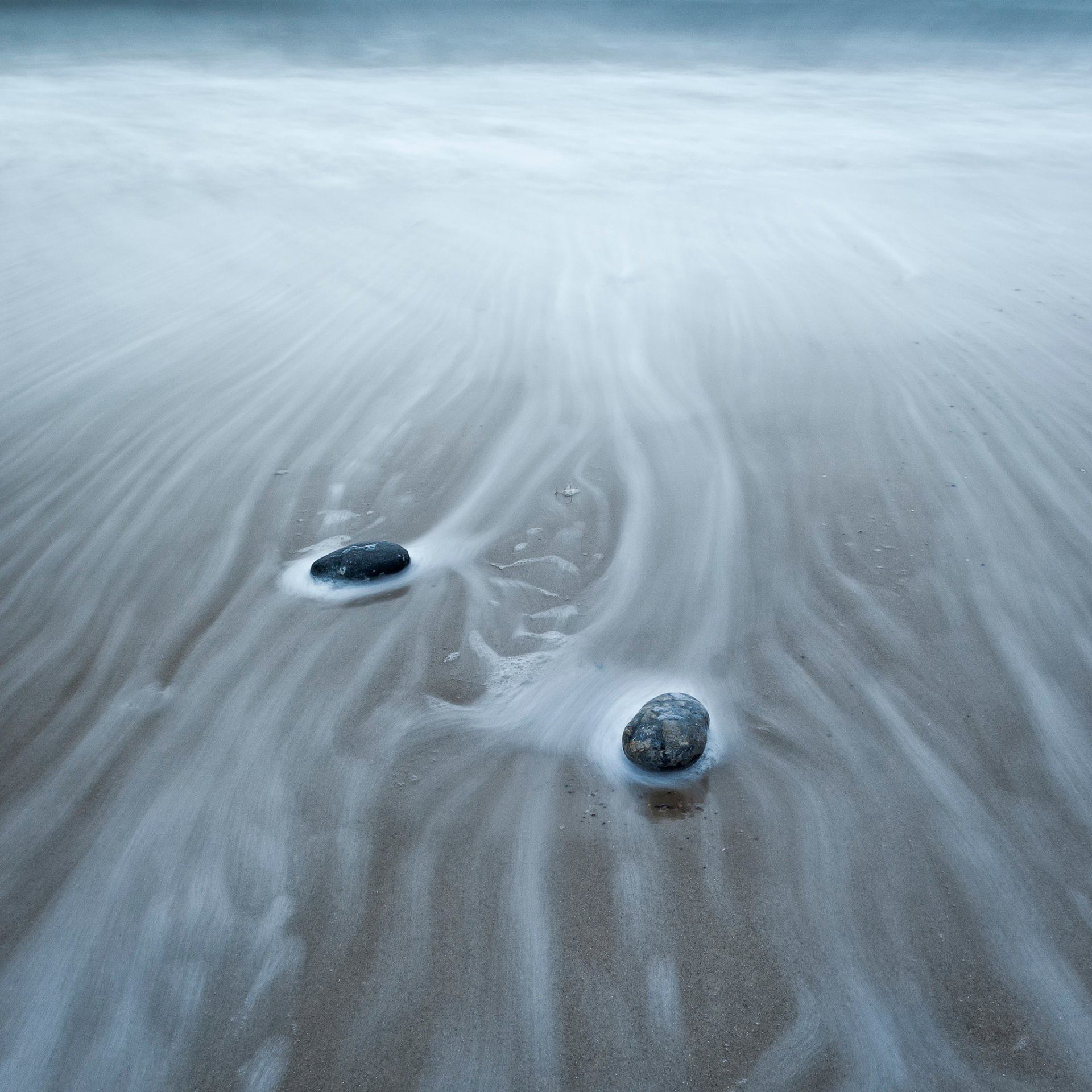 Ein Mädchen in einer gestreiften roten Jacke sitzt auf dem Sand