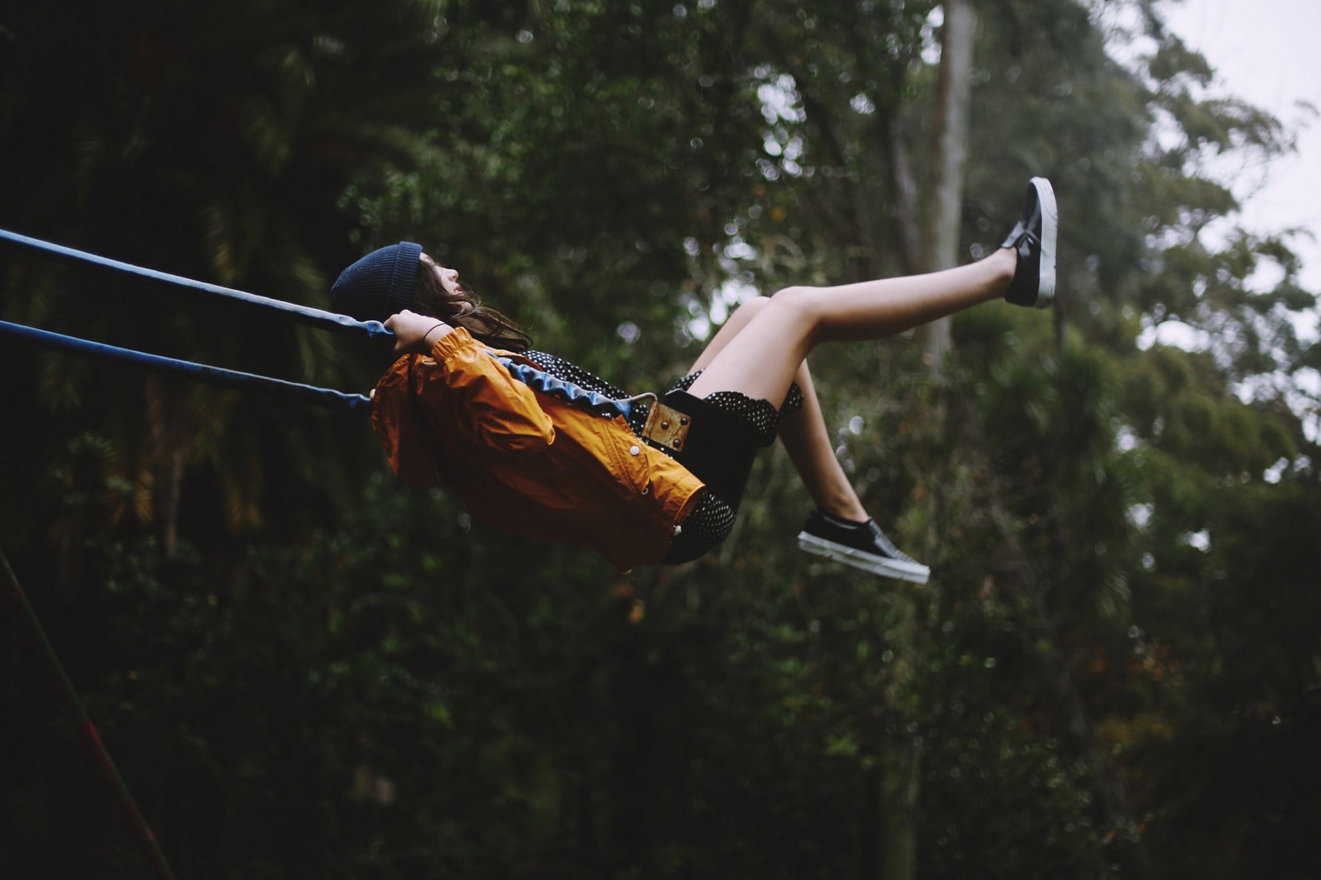 Mädchen in der Natur auf einer Schaukel mit einer geheimnisvollen Stimmung