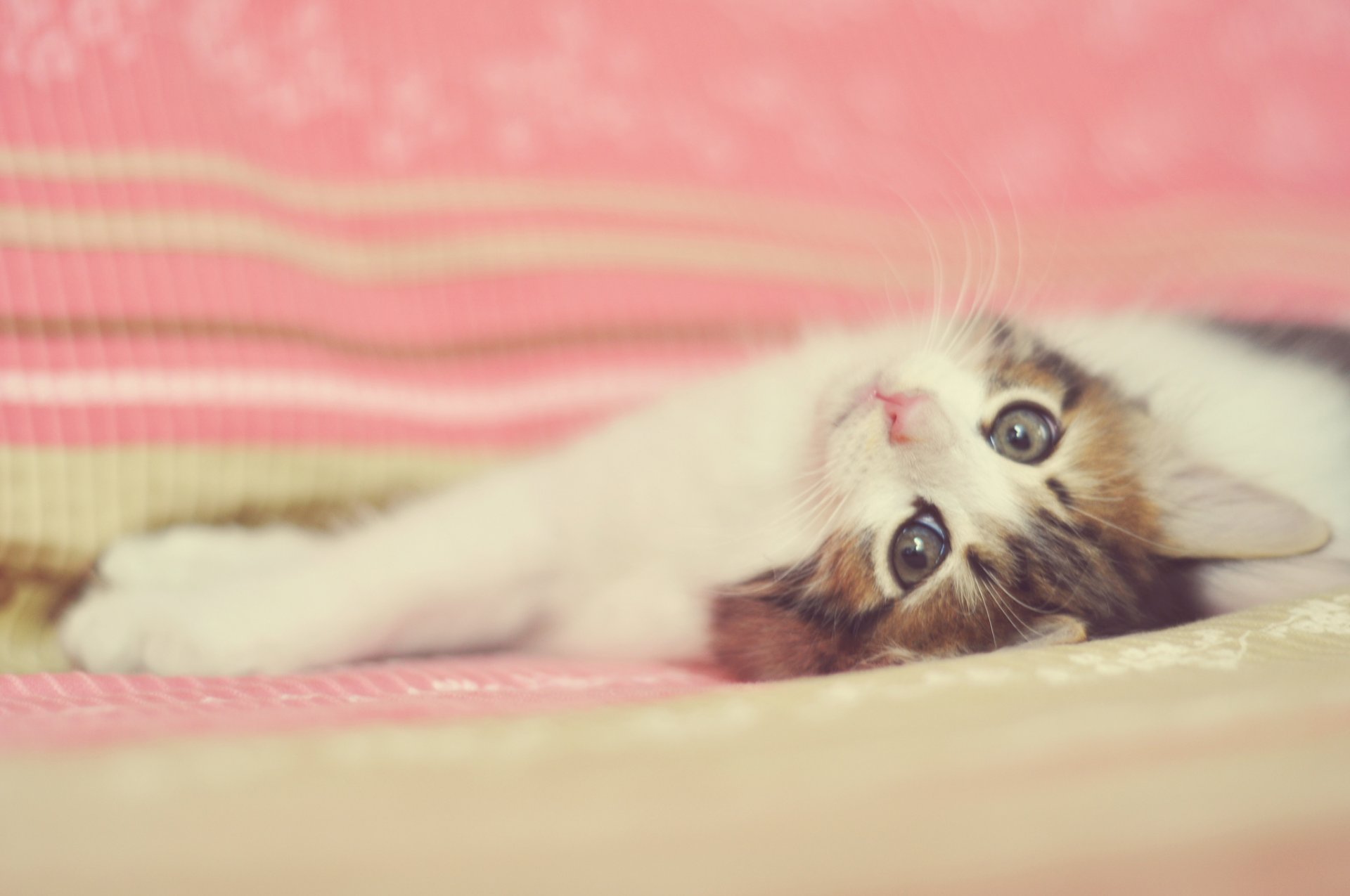 Süße Katze liegt auf der Couch und schaut den Besitzer an und will etwas sagen