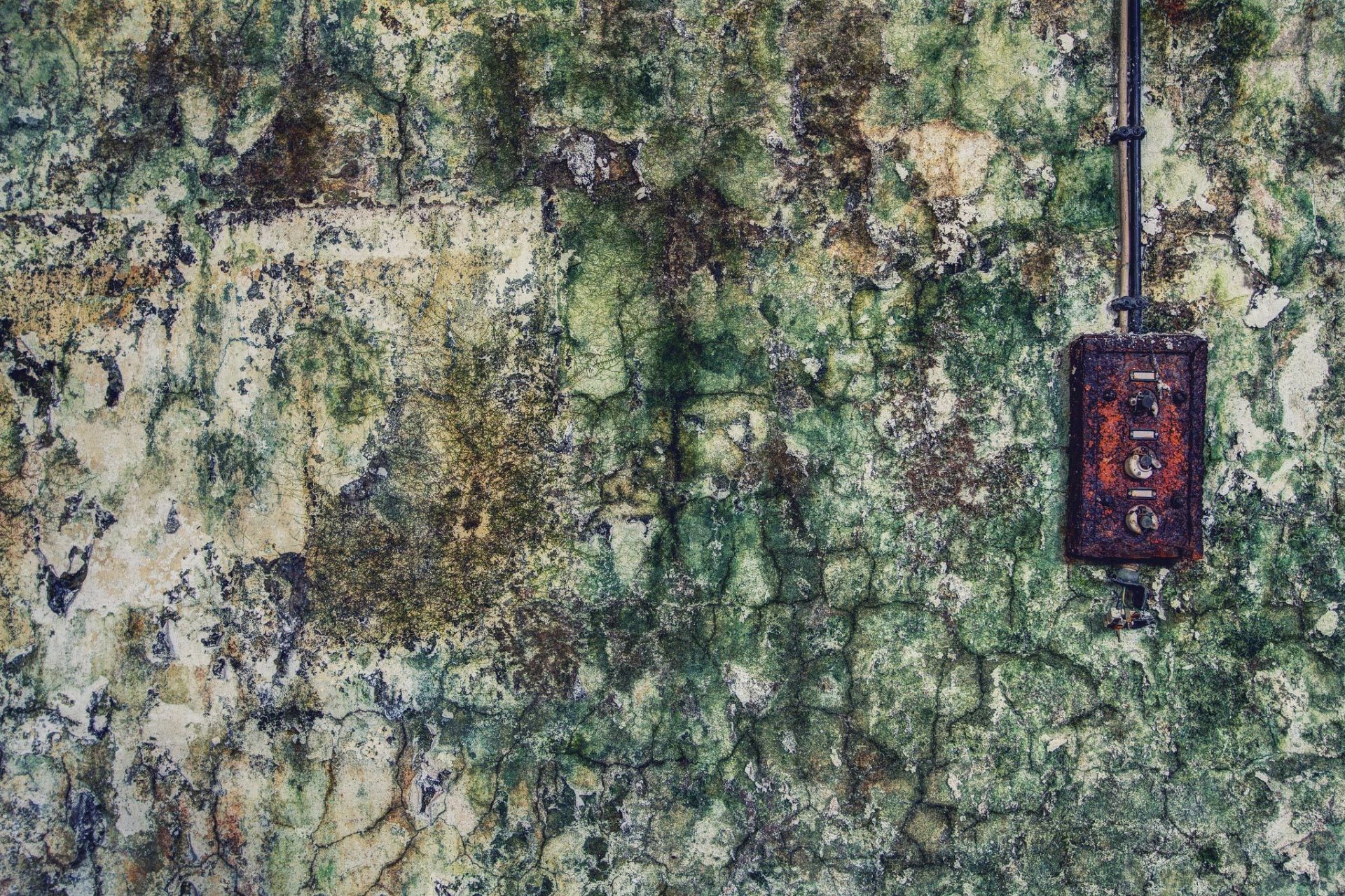 Eine wand mit rissigem putz und einem schalter mit verdrehter farbeEine Wand mit rissigem Putz und einem Schalter mit verdrehter Farbe