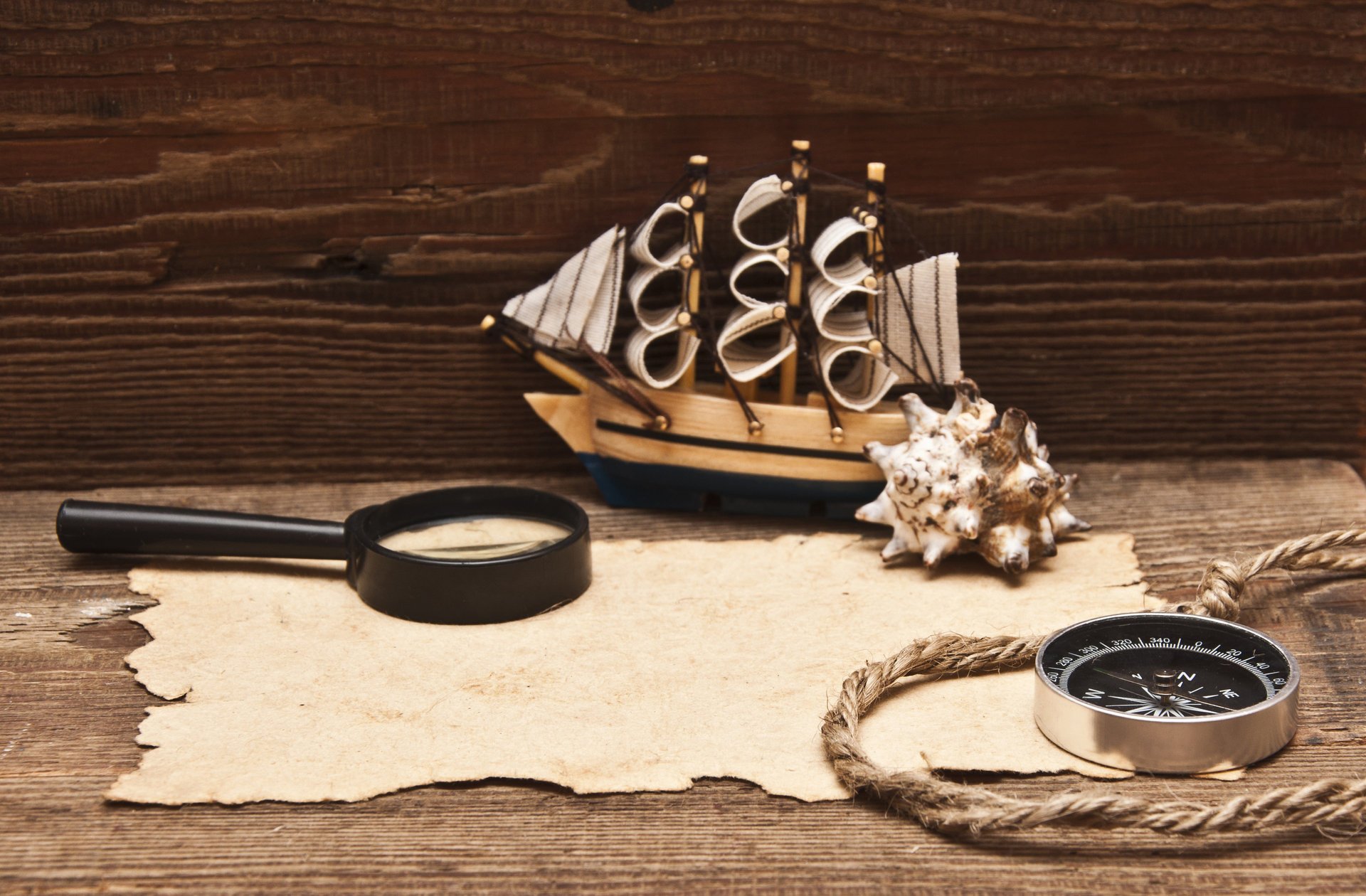 Auf dem tisch liegt eine handschriftliche lupe, ein kompass und ein seilAuf dem Tisch liegt eine handschriftliche Lupe, ein Kompass und ein Seil